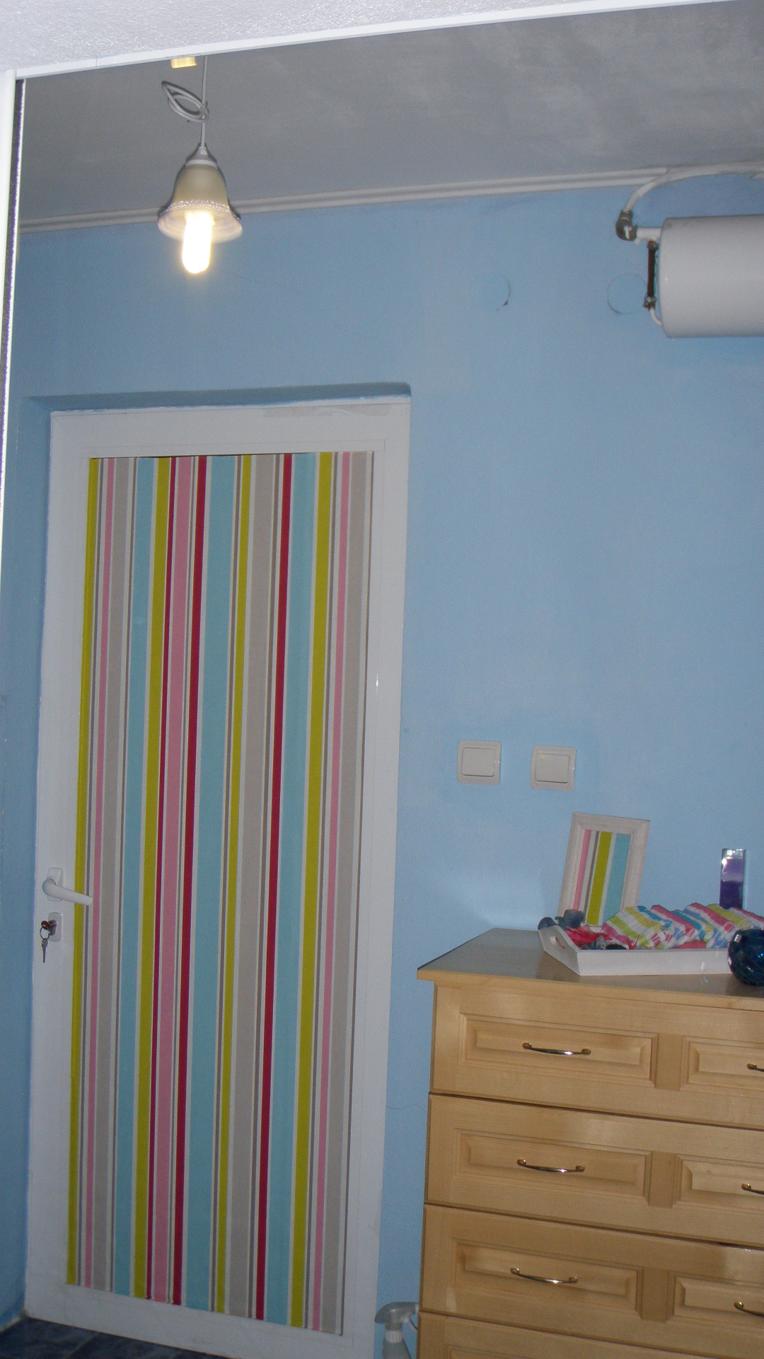 Идеята я видях на апартаментска входна врата от 2те страни беше със стиропор 2см и фолио. Но на мен фолиото не ми допадна и затова залепих тапет.