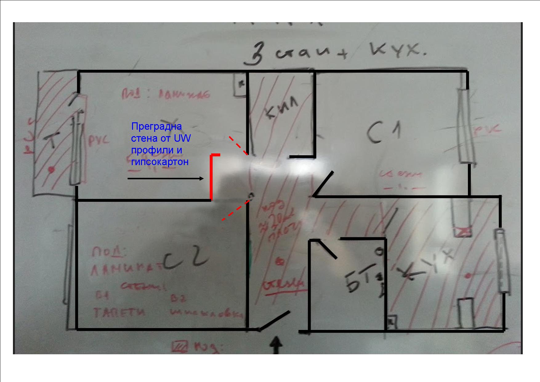 Това предполага отваряне на нова врата от към коридора (посочено от зелената стрелка на схемата) и затваряне на съществуващата врата към хола. Панела е дебел 20 см.