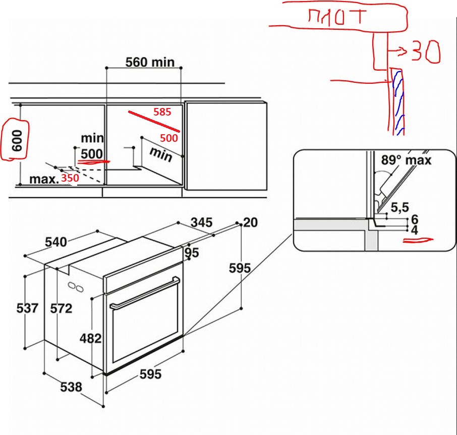 Качвам ти няква схема от нета на шкаф, с червено са важните рамери, това 4мм е важно защото от там влиза студен въздух, 600 са го дали ама не винаги е достатъчно и за това преди като монтирах кухни винаги слагах летвичка 30мм под плота и никога не съм имал проблем с фурната.