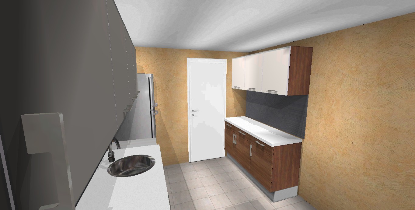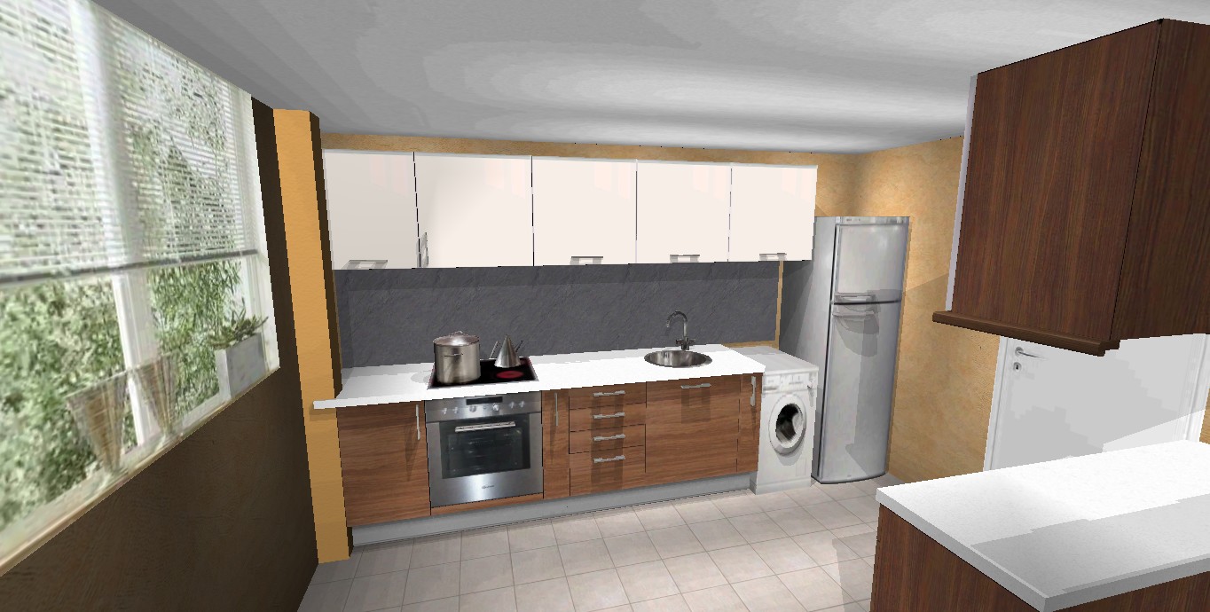 П.П. Програмата си има някои недостатъци. Вместо врата е проход/отвор към трапезарията. Над пералнята не може да се сложи плот. Шкафчетата на срещуположната стена може да завършват с заобляне... Котлоните ще бъдат само два центрирани вместо четири. Мивката може да е правоъгълна, а не овална...