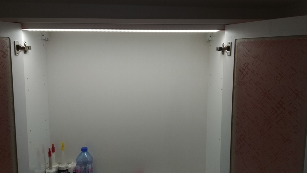 Лентата под шкафовете е директно върху плоскостта, засенчена е с пластмасов г-образен винкел. Сянката е настроена експериментално преди окончателния монтаж.
