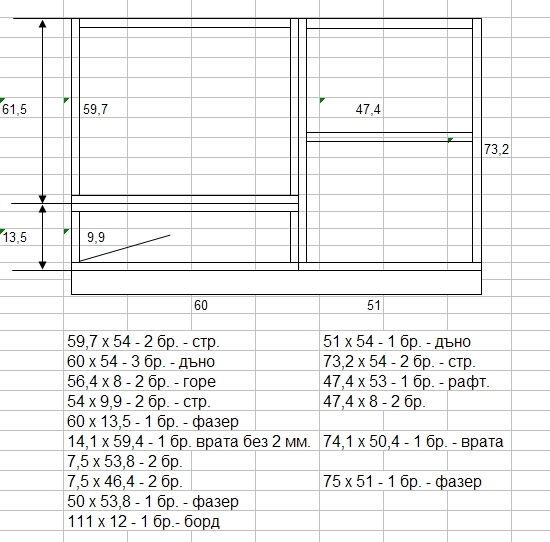 ). Искам да направя следното : да разположа фурната и плота от дясната страна и под нея да има чекмедже, от ляво искам да има чекмедже а под него да има щкаф с два рафта, а отгоре върху всичко ще сложа термо плот. Минималните размери на монтажната схема на фурната са дълбочина 550, широчина 560, височина 600. В момента сам в процес на търсене на фирма за разкрой и кантиране но проблема ми е че аз съм от Севлиево и след като посетих няколко малки фирми/цехове за производство на мебели бях тотално отрязан. Но аз не мисля да се отказвам и ми излязоха за момента няколко питания :