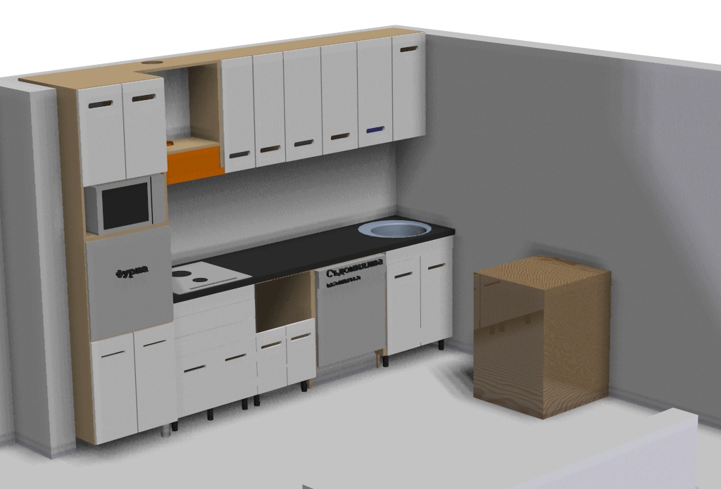 Ей това ми е кухнята. На тоя рендер чекмеджетата се виждат при по-внимателно поглеждане, ама толко може Solid Edge. 2-те вратички дето са ниски, са такива защото не съм решил дали да има чекмеджета над тях или да си остане шкаф. И над оная кафавата кутия, която всъщност ще е черна и вътре ще е хладилника ще има барплот, ама съм го скрил за да се вижда по-добре. Гръб не съм слагал, ама разбира се, ще има.