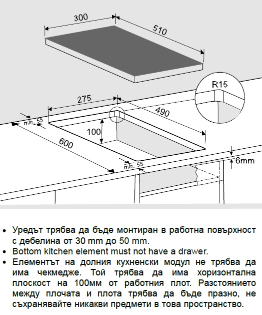 5. Относно монтирането на керамичния плот и газовия плот, имали някакви изисквания за нещо като кутия под тях? И ако има такава трябва ли да има някакво „проветрение” (охлаждане), отвори от пред, от зад?