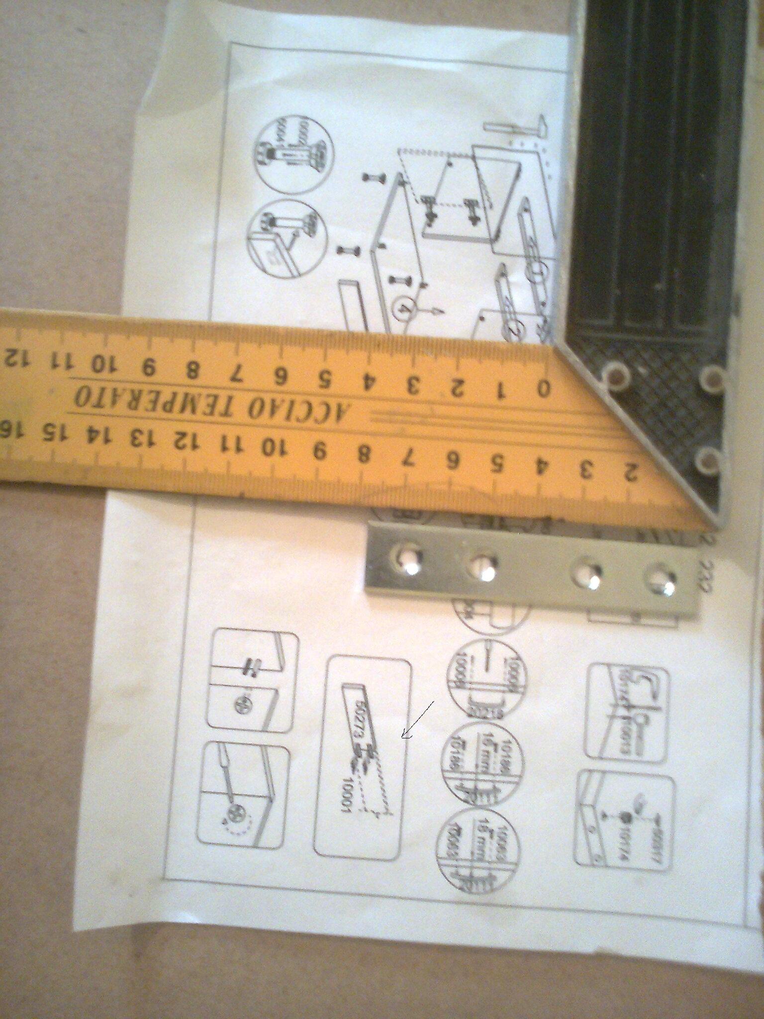 Във всеки от кашоните с долните шкафове има по една права метална планка с четири отвора. В описа е отбелязана като 50273. Дълга е около 8 см и според приложеното в кашона листче се завинтва към нещо. Е, не мога да разбера какво е предназначението й. С дорисуваната стрелкичка съм го посочил на снимката.
