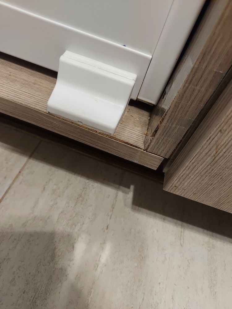 Забелязах, че долу в ъгъла между страницата и дъното на шкафа ми с вградения хладилник се е образувало частично подуване на ПДЧ-то. Прилагам снимки. Имате ли идеи какво може да се направи по случая, което да е естетично все пак? Освен да се сложат две ъглови лайсни друго не мога да се сетя? Не знам обаче какви точно. Ще потърся из магазините, но ако някой се е сблъсквал с това и може да помогне идеи, ще съм благодарен