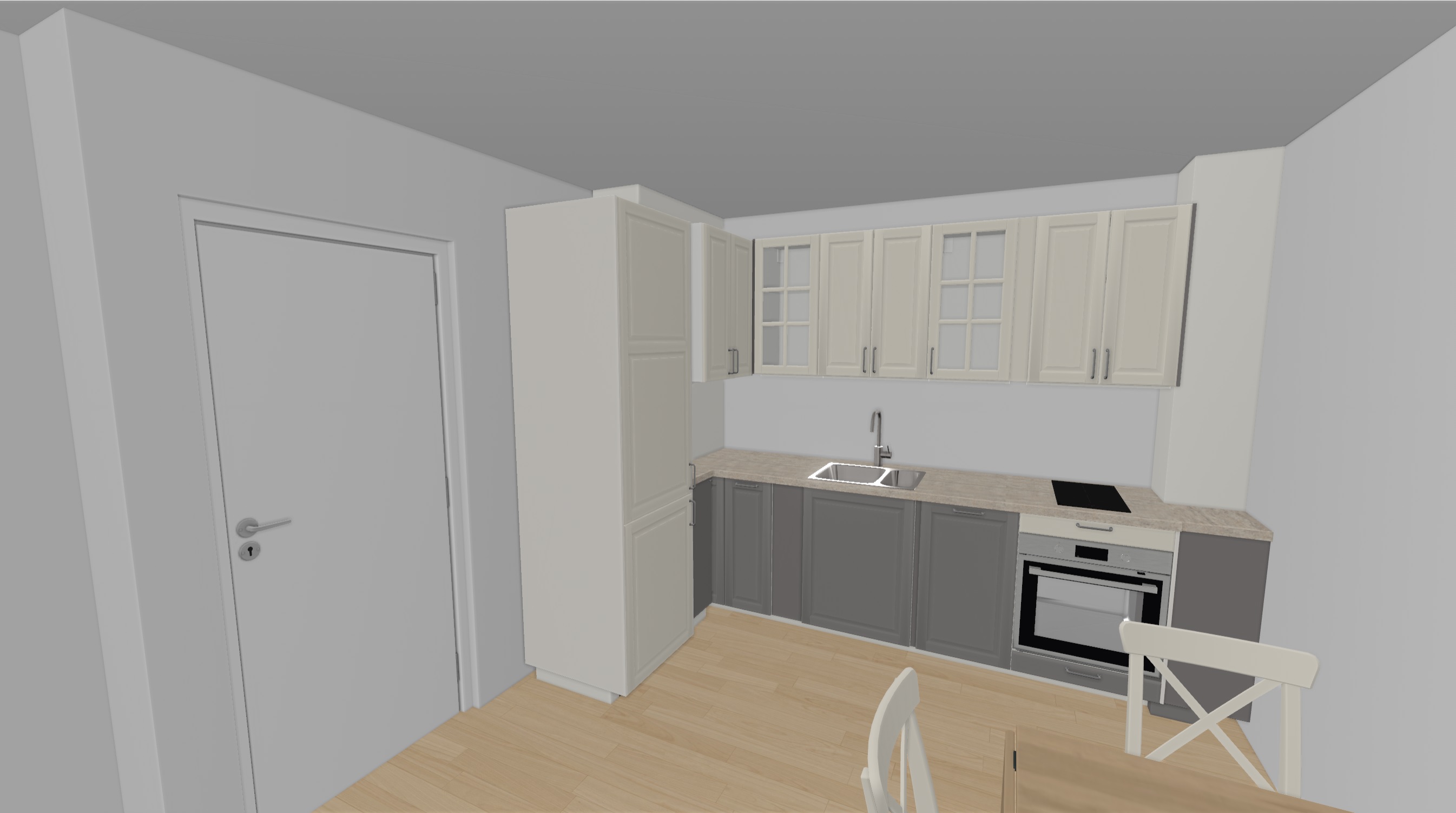 Става въпрос за нова сграда, апартамента е по БДС. Все още не мога да реша за подредбата на кухнята. Има изводи , които обаче се надявам да могат да се преместят при избор на различна конфигурация. Моля за съвети. Най-важният въпрос е къде да са хладилника, мивката и готварския плот с печката и как точно да ннаредя горния ред шкафове. Сама съм правила примерни дизайни, просто да добия представа. Кухнята няма да е на П, както е на скицата от строителя, а Г както е на примерния дизайн.