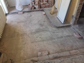 Апартамента е строен някъде около 1970. Пода една част е мозайка, една част беше дюшеме. Дюшемето беше дебело, все едно са правили покривна конструкция. Като го махнах, се отвори дупка дълбока около 8 см. Имах тухли единички, и реших вместо да ги нося по стълбите, да ги използвам и да попълня дупката с тях. Залепих ги с флексово лепило с фибри, и отгоре мисля да направя замазка с Циментол.