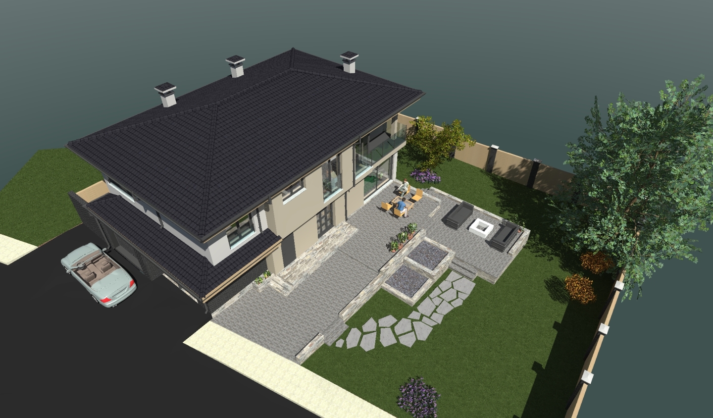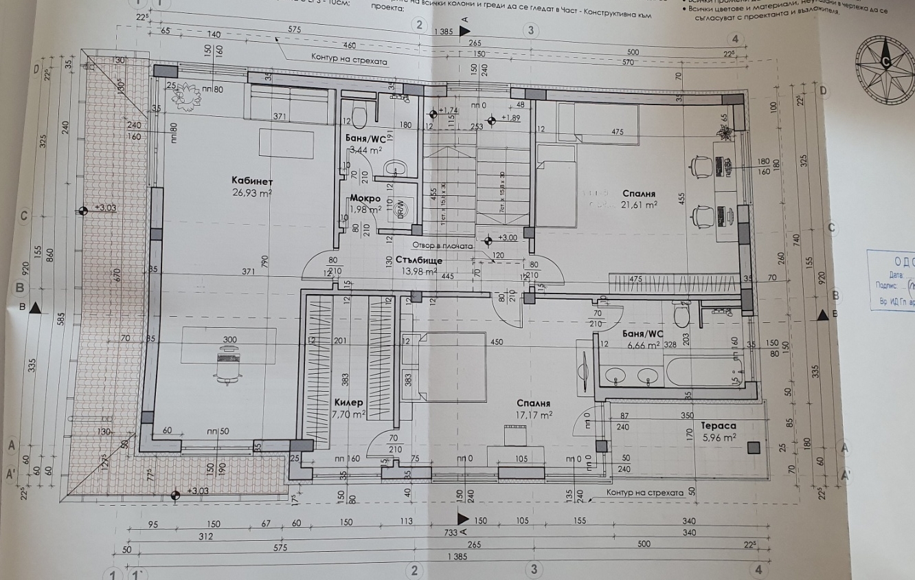 Извинявам се, че прилагам снимки, в момента не съм на компютър, на който имам чертежите. Фасадата е ориентировъчна, само тухличките са на място, "дървената" част архитекта нямаше възможност да я направи, нямал текстурите, а верандата и бъдещата ограда могат да се игнорират, няма да имат нищо общо.