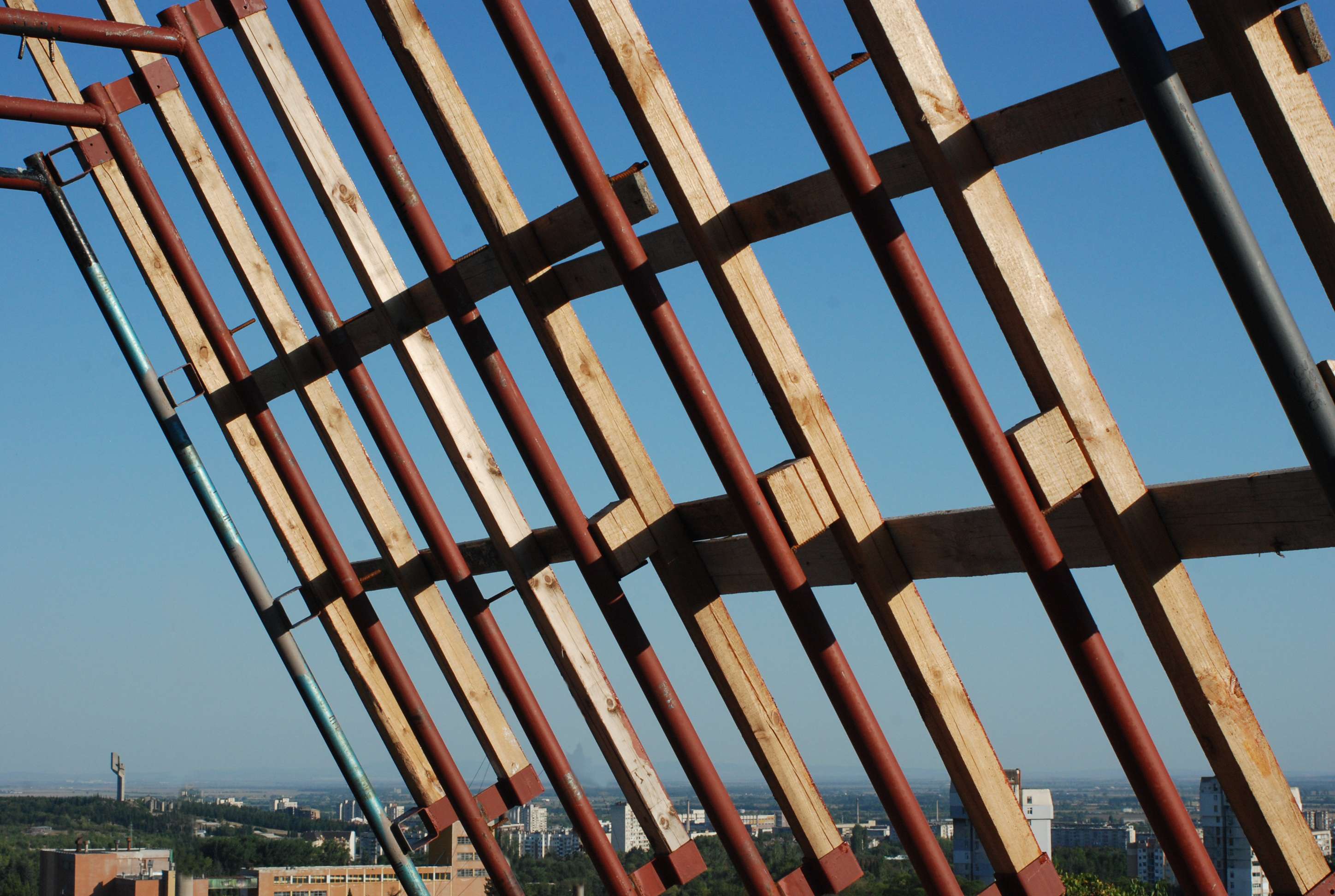 Г-н Владимиров, не съм ви отговорил точно, затова допълвам - стойките не са захванати за керемидите, а за носещата метална тръбна конструкция - слагам нов кадър, на който се виждат дебели стърчащи болтове Ф-22. На другите фокуси се вижда и как съм решил въпрос със стоманената и дървена конструкция. Опростих нещата като ползвах нарязан затворен профил 100/100/4.5. Поръчах си греди на точен размер 88/88, съединих затворения профил към тръбата със шина 100/10, по същият начин конструирах и козирката издадена напред, като затворения профил там е 120/120/4.5 и съответно гредите 105/105.
