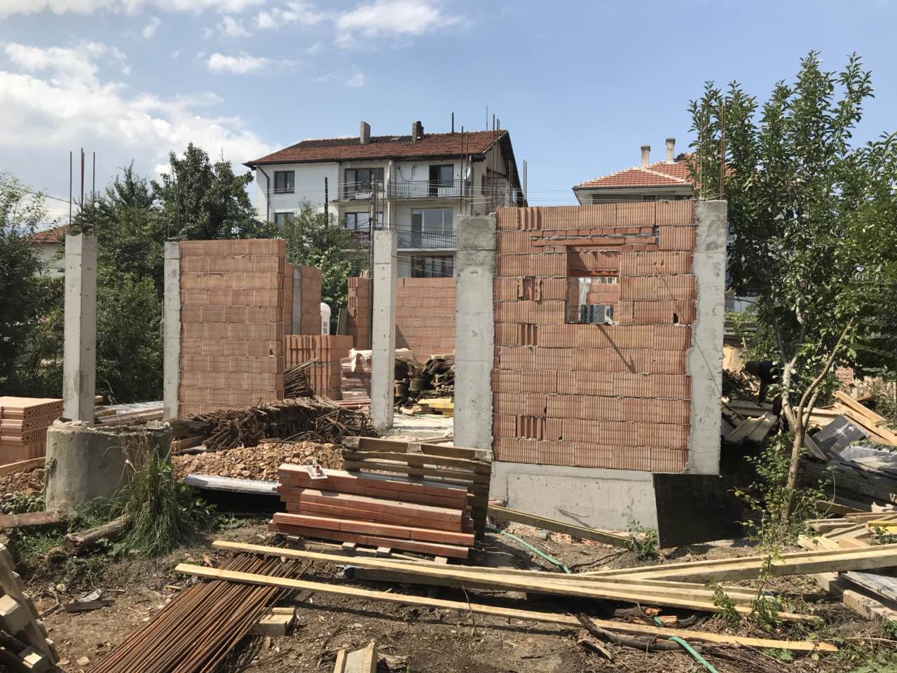 Започнахме с изкопа втората половина на юли, но поради валежите строителните работи започнаха през август. В момента се кове шперплат на основния двускатен покрив. Има и втори двускатен по-малък над балкона, и едно малко скатче над кухненския килер.