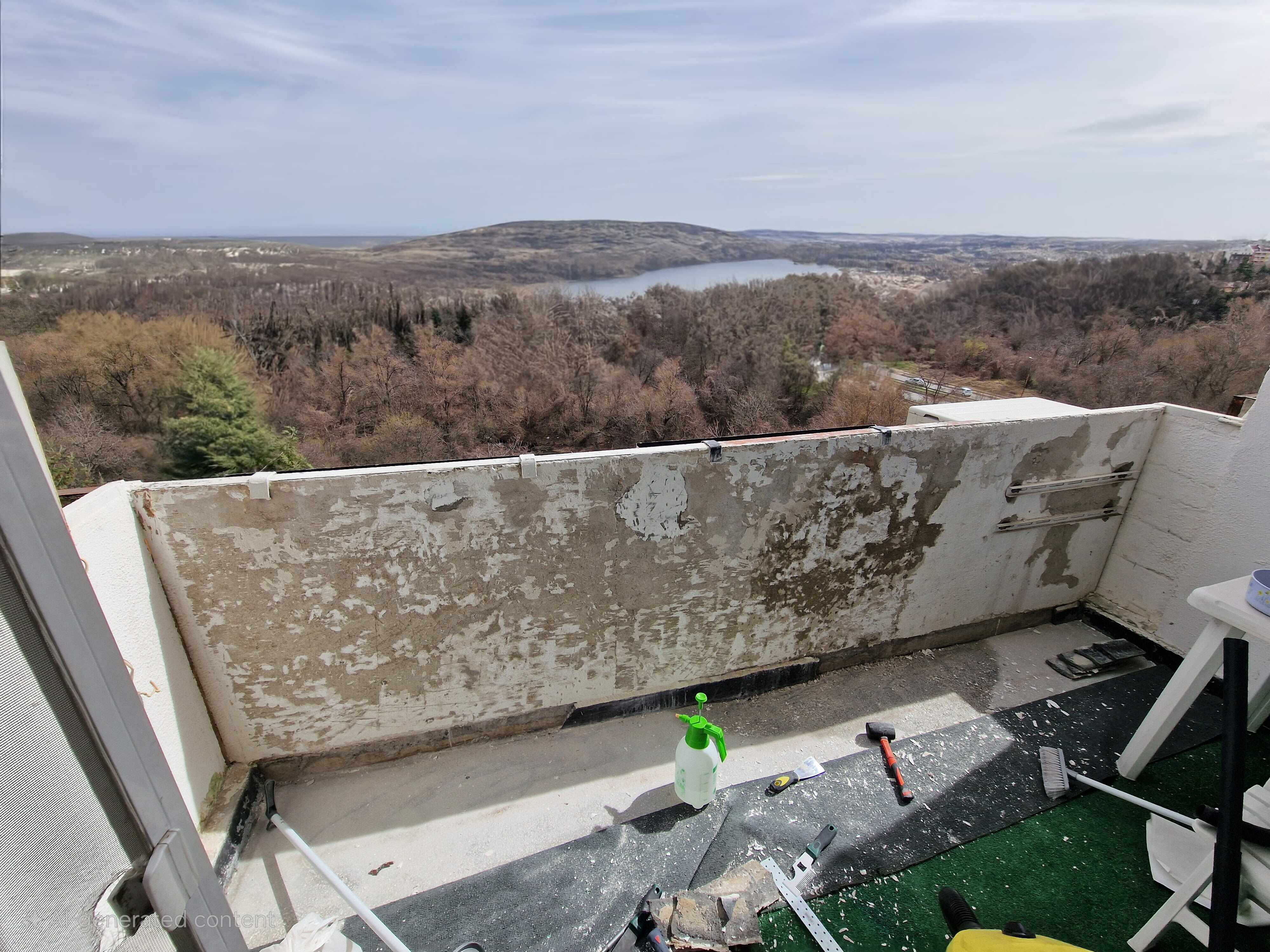 Терасата е ремонтирана преди години като е пръскано с някаква боя, която беше напукала на места на панела на парапета. Реших да я сваля заедно с мазилката, която изглежда да е около 1-2мм варова. За жалост боята се оказа хем хидрофобна, хем неразтворима (или минерална или някакъв вайс, пробвах с vitex препарат за сваляне на боя, МРТ, чист ацетон, но не помогна много), та се наложи да блъскам на ръка предимно с шпатула и чук.