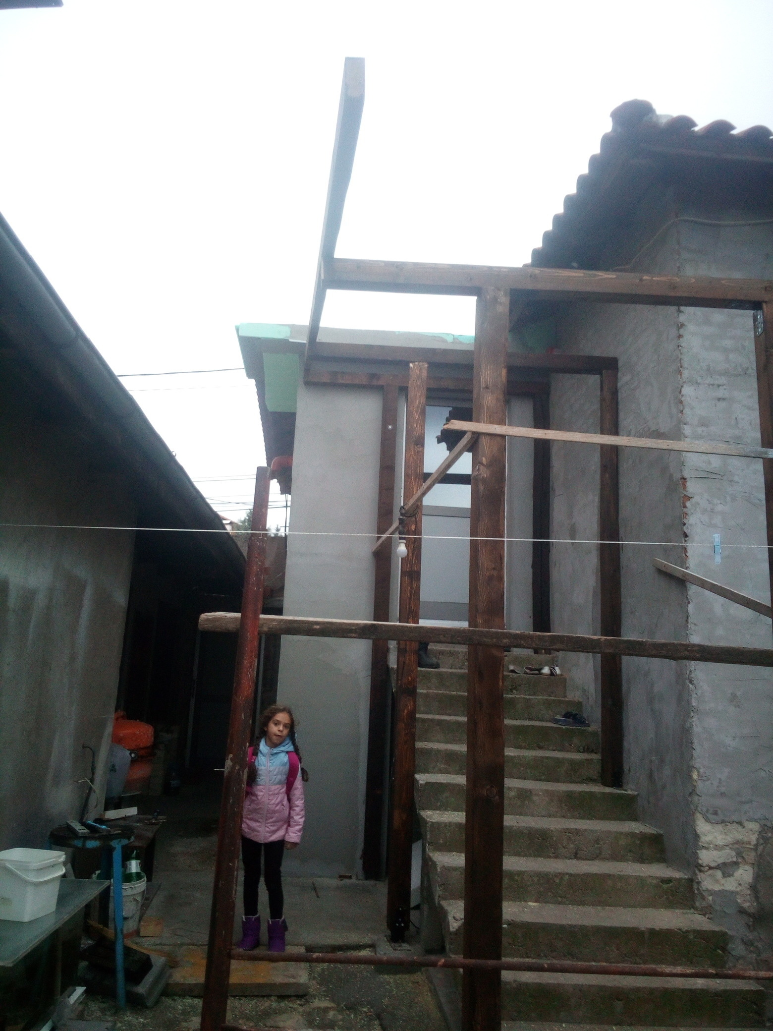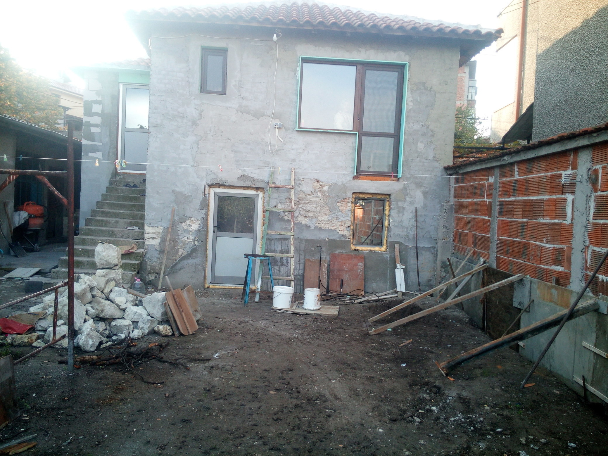 Ама и майстори, ръцете си оставили на оградата. От последната снимка ще добиете представа къде искам да направя тераса, за сега съм се ориентирал да е от дувара до другия ъгъл на къщата до външните стълби и да кажем 3м. на зад към двора. Това се пада на север и за сега си мисля, че няма да е много удачно да я покривам и от горе като чердак и не че не искам, но си мисля постоянно ще е сянка, а ако я оставя открита и поставя на стената под керемидите закрепена тента или как му казват дето при нужда се разпъва /Дъжд, Слънце/ и когато не е нужно се прибира към стената. Няма да е много красиво, но може би функционално? П.П. относно външното стълбище вече съм го покрил с навес и в бъдеще мисля да затворя, но за това по на там ще стане въпрос.