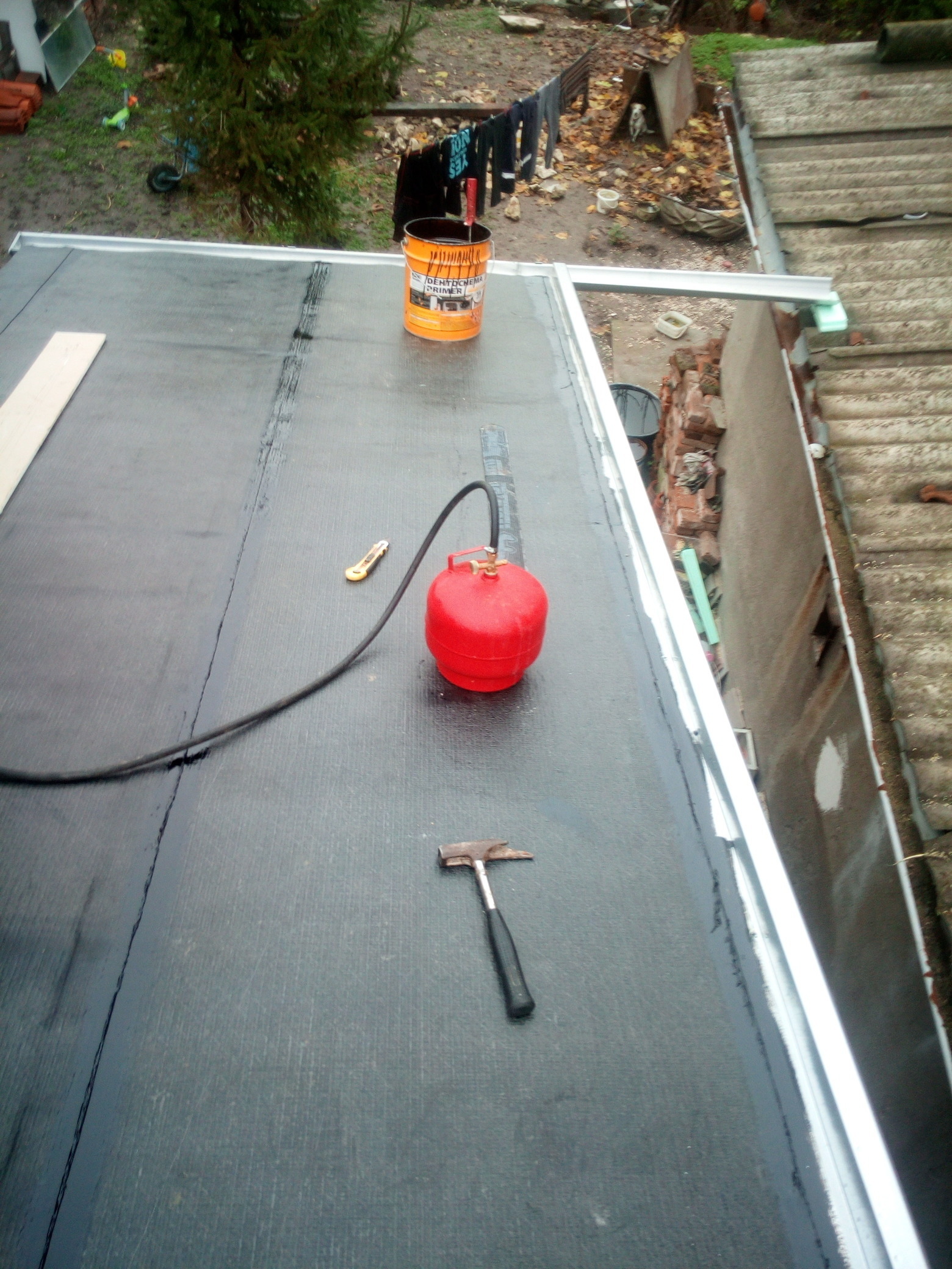 Имах помощник за поставянето на страничната челна дъска щото сам е трудно и няма смисъл да се мъча, ако има кой да помогне и по - бързо става. Успях да сложа слой хидроизолация без посипка, но с посипката ще полагам когато пак се затопли времето. За сега дори един слой течове няма , но за всеки случай пък и да е по завършено ще го размина с такава червена но с посипка 4 или 5 милиметра е чака в гаража. Чудех се дали да е пчелна пита, но няма да се вижда и е излишно скъпа а ефекта е един и същ освен визуалния.
