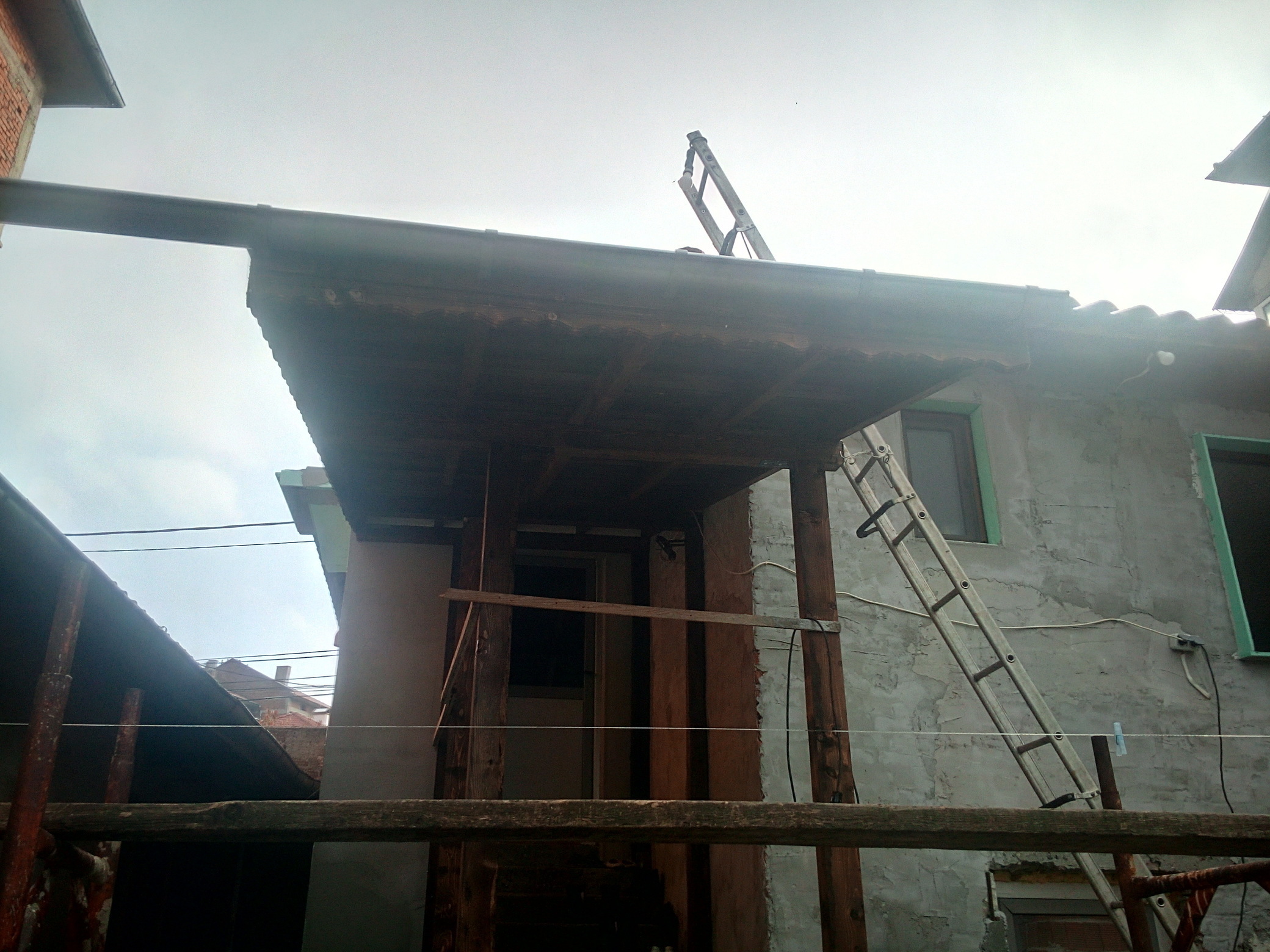 Ама и майстори, ръцете си оставили на оградата. От последната снимка ще добиете представа къде искам да направя тераса, за сега съм се ориентирал да е от дувара до другия ъгъл на къщата до външните стълби и да кажем 3м. на зад към двора. Това се пада на север и за сега си мисля, че няма да е много удачно да я покривам и от горе като чердак и не че не искам, но си мисля постоянно ще е сянка, а ако я оставя открита и поставя на стената под керемидите закрепена тента или как му казват дето при нужда се разпъва /Дъжд, Слънце/ и когато не е нужно се прибира към стената. Няма да е много красиво, но може би функционално? П.П. относно външното стълбище вече съм го покрил с навес и в бъдеще мисля да затворя, но за това по на там ще стане въпрос.