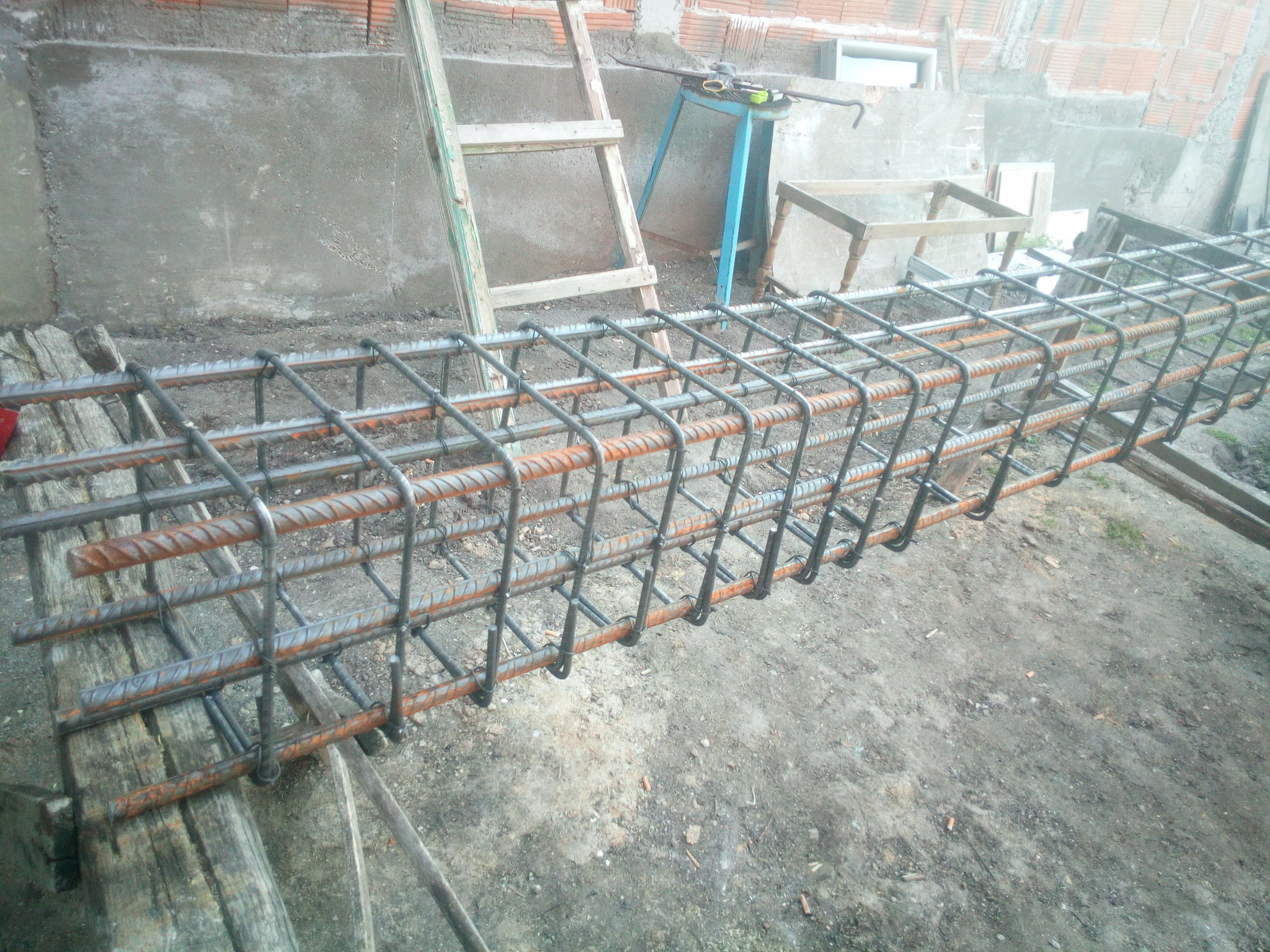 3. Да ще я вкопавам и до колко ще покаже мръсната вода, да покрия тръбата. Замислил съм понеже нивото на площадката под терасата ще стане по - ниско от нивото където ще е площадката за горните стълби , а и от почвата към двора на зад , но с подходящи наклони и козирка на терасата там вода дъждовна няма да се налива много, но все пак при вятър с дъжд или сняг може би ще има и затова ще оставя сифон на пода да има да я поема или, като се мие. До преди малко точно това правих но се стъмни и не завърших, време е да изкопам и пусна ВиК - за да съм на ясно с нивото.Това трябваше отдавна да свърша, но не смеех заради сезона. Даже успях след работа да вържа една колона и ми дойде добра идея за скрита греда в средата на плочата напречна стъпила върху зида и на отсрещната средна колона към двора. Добере че порасна деня. Към момента на око определям че ще сваля между 20 и 30 см. и да получа отвор на врата нормален от 200 см. и таван около 220- 230 см.