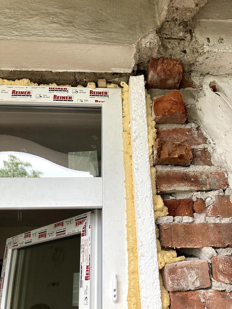 Та препоръчвам: Сваляне на дограмата, иззидване на нормален зид 25 см по цялата стена, монтиране на дограмата, а после като ви е кеф си правете изолация със стиропор. Ама и той трябва да има стабилна основа.