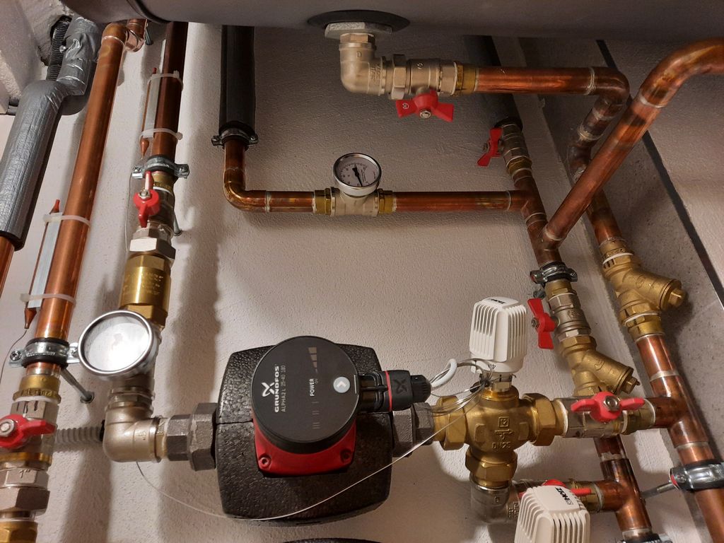 По правило този вентил трябваше да е на връщащата линия, за да разпределя към буфера и към помпата, но картинката (при мен) става малко по-сложна и не ми достига височина за да я събера. За това прибягнах до това решение. Наопаки малко, но работи.