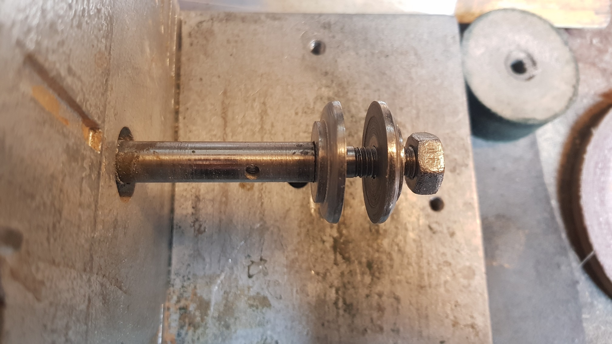 Гледам, че вала на машинката има отвор. Премери го колко е широк и дълбок и прецени дали едно такова: https://www.ebay.com/c/4003474252, разбира се подбрано с подходящите размери няма да свърши работа. Стягащата гайка е М8.
