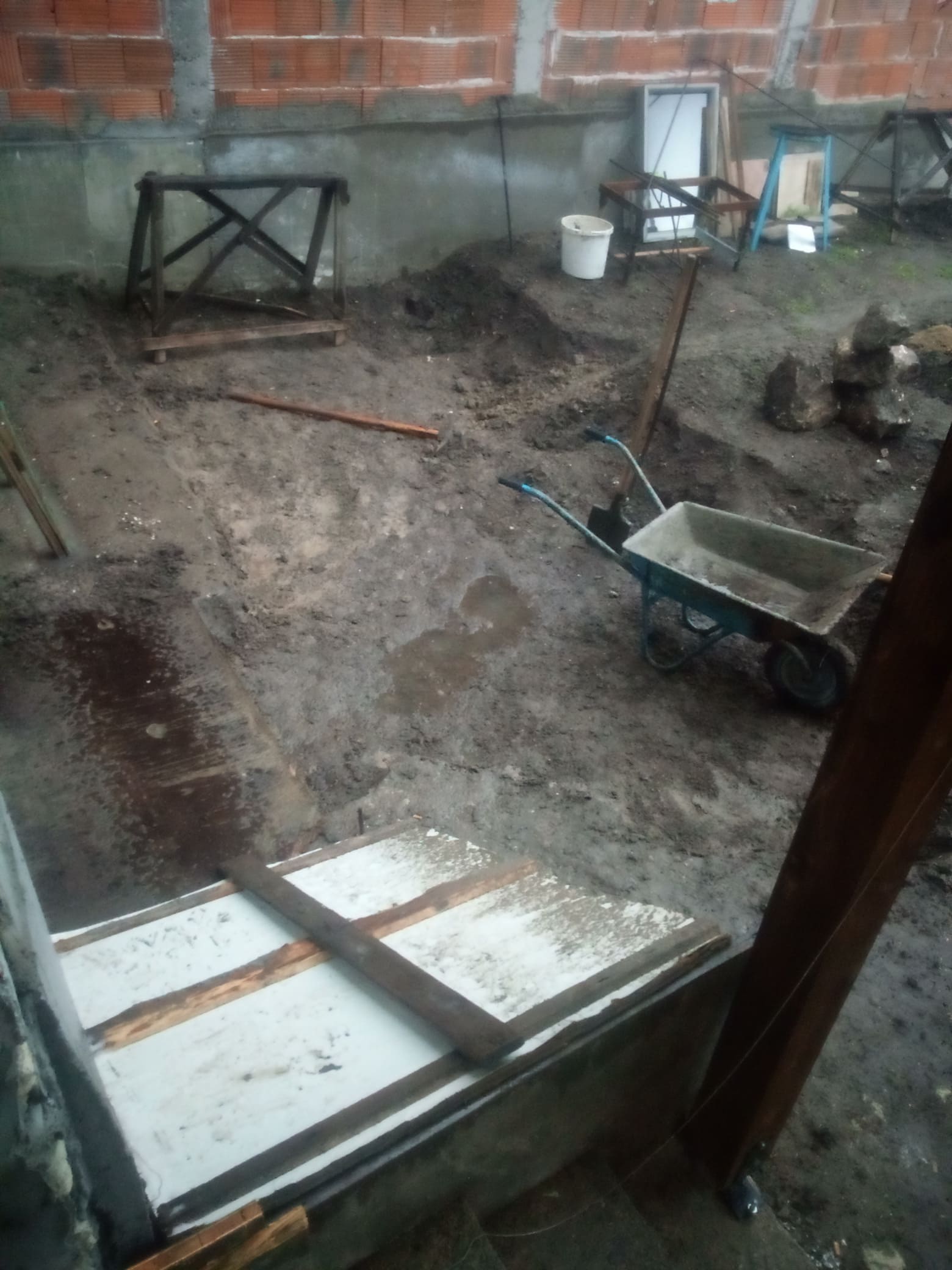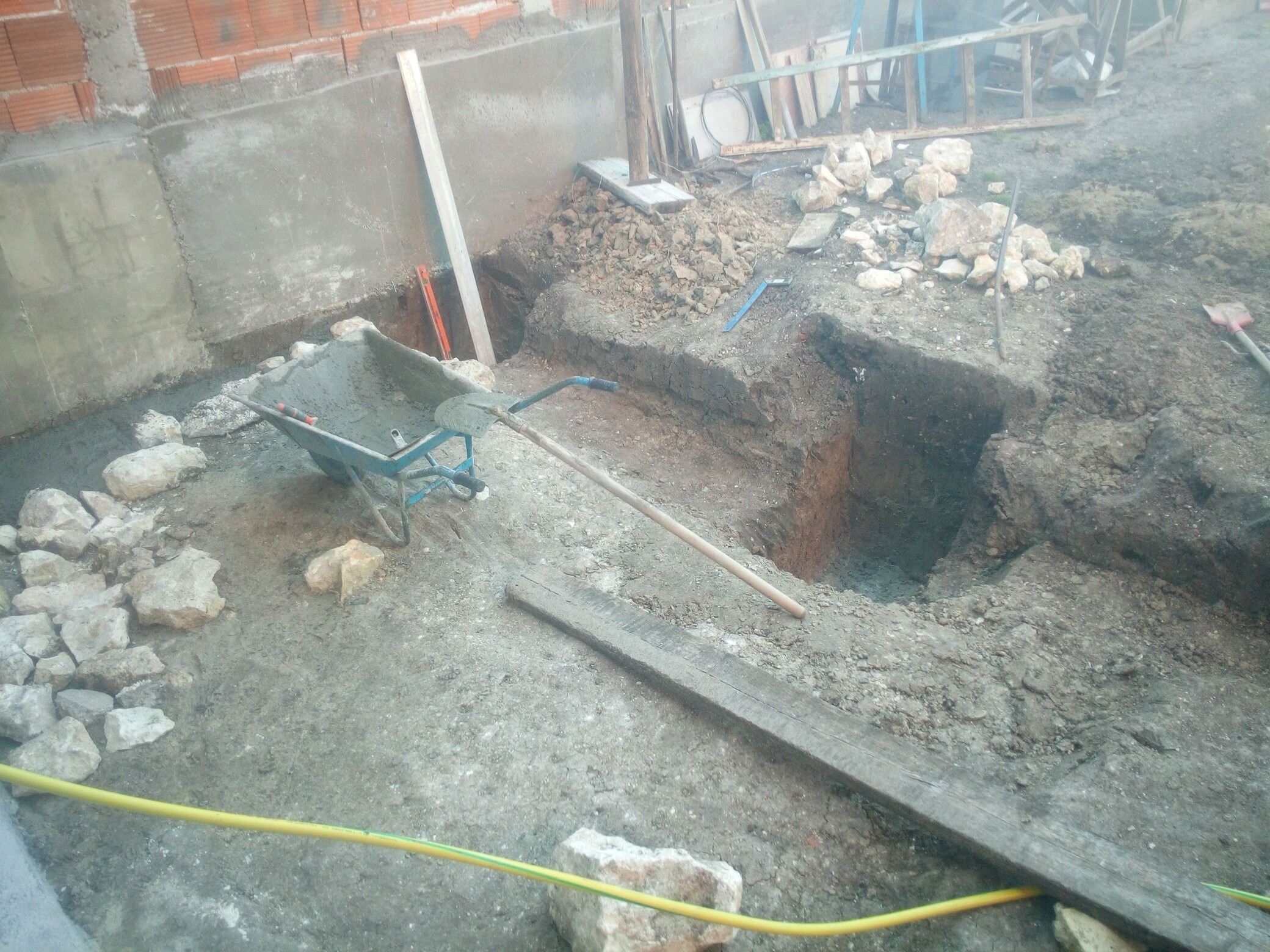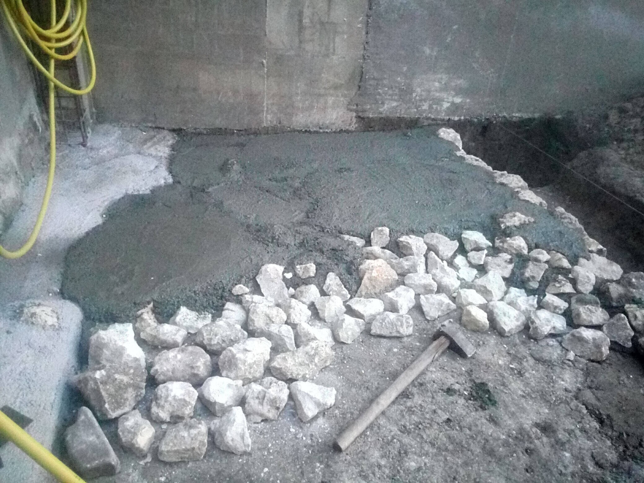 Имах много камъни и реших да ги използвам за пълнеж в подложния бетон, като ги миех старателно преди полагане. Бавно ставаше, ама като за сам човек е така, чакъла и пясъка си ги карах с ремаркето, после ги смесвам и с цимента и бъркай бъркай, абе откъсана работа.