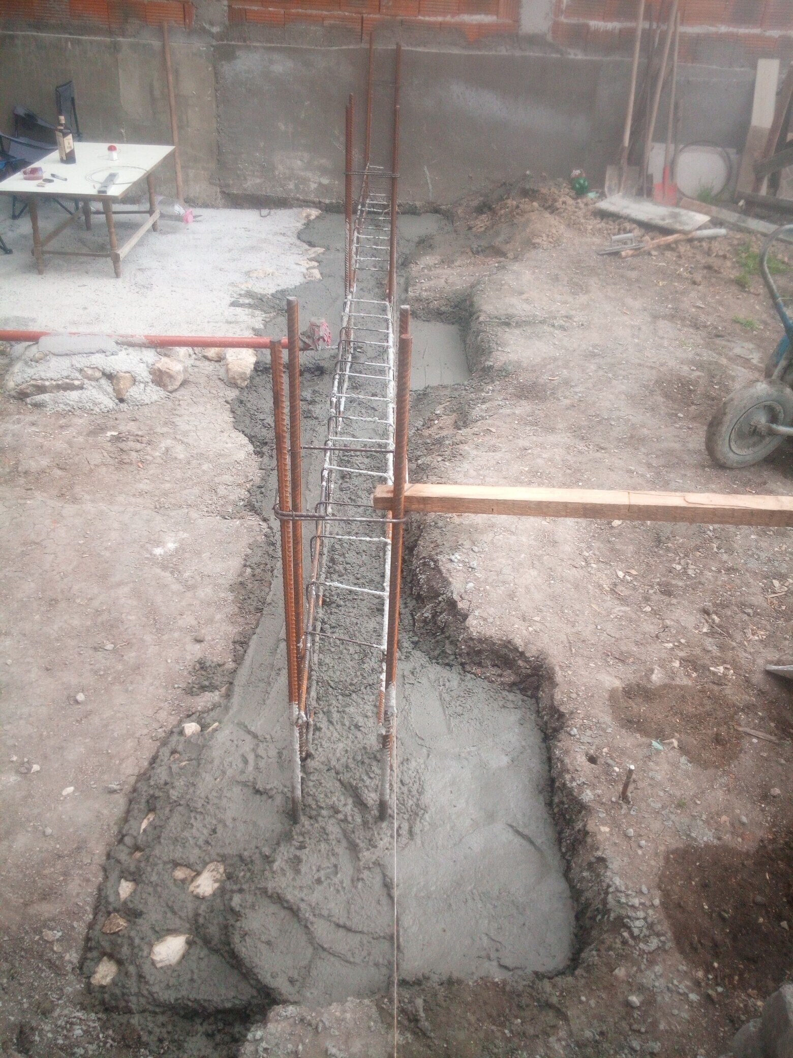 На задните колони арматурата беше №14 ама сложих повече пръчки, а на предните 3 колони фусовете ги заложих №16 и реших да карам така и на горе но обикновенна колона с 4 пръчки и бигли. И така почнах малко по-лека работа от копане на пръст, каманаци и бетони да бъркам, друго си е да вързваш арматурка и да чукаш кофраж докато си пиеш бирата. Имах кофти късмет като наливах това към стълбите за стеничката - ходих един път за чакъл стоварих го, после за пясък и цимент и тамън на пътя / пред гаража/ разбърках едно голямо бъркало готово за наливане и даже налях малко заваля из ведро, викам язък и на пари и на бъркане, но имах найлон завих го хубаво и викам квото стане. Чак след 2-3 часа спря и за късмет като открих не ми беше измило цимента та налях, ама пак по мръкнало.