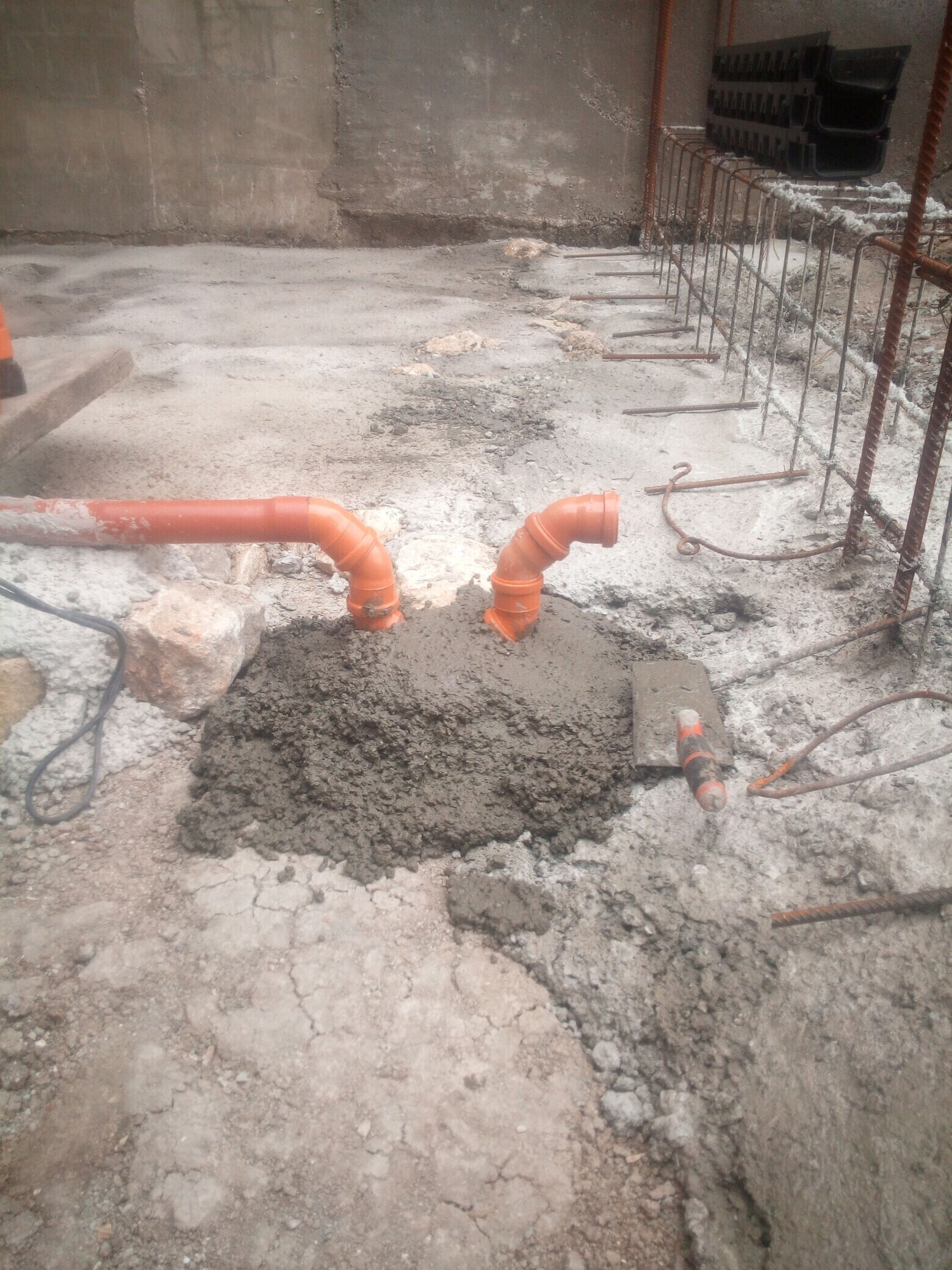 След като бях готов със трите стъпки реших, че тия 3,5 - 4 кубика няма да ги бъркам на ръка и поръчах земновлажен бетон Б15. То пак на ръка ама е по-лесно, с маркуча и бъркане. Имах един помощник и като почнахме дойдоха и двама комшии да помогнат без да съм ги викал, да са живи и здрави, така аз само карах и наливах. После продължих пак по стария метод докато залея долната плоча, да сложих и мрежа.