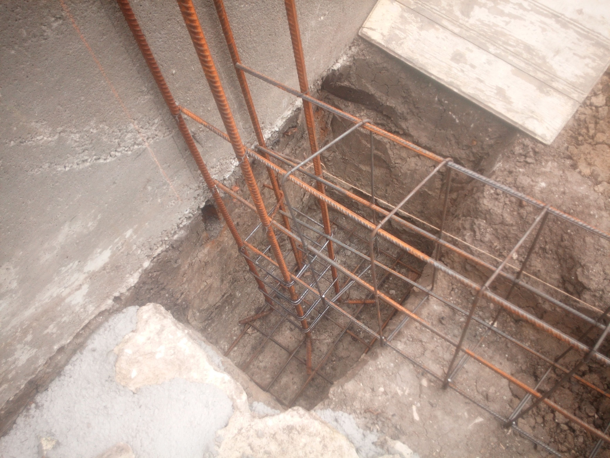 На задните колони арматурата беше №14 ама сложих повече пръчки, а на предните 3 колони фусовете ги заложих №16 и реших да карам така и на горе но обикновенна колона с 4 пръчки и бигли. И така почнах малко по-лека работа от копане на пръст, каманаци и бетони да бъркам, друго си е да вързваш арматурка и да чукаш кофраж докато си пиеш бирата. Имах кофти късмет като наливах това към стълбите за стеничката - ходих един път за чакъл стоварих го, после за пясък и цимент и тамън на пътя / пред гаража/ разбърках едно голямо бъркало готово за наливане и даже налях малко заваля из ведро, викам язък и на пари и на бъркане, но имах найлон завих го хубаво и викам квото стане. Чак след 2-3 часа спря и за късмет като открих не ми беше измило цимента та налях, ама пак по мръкнало.