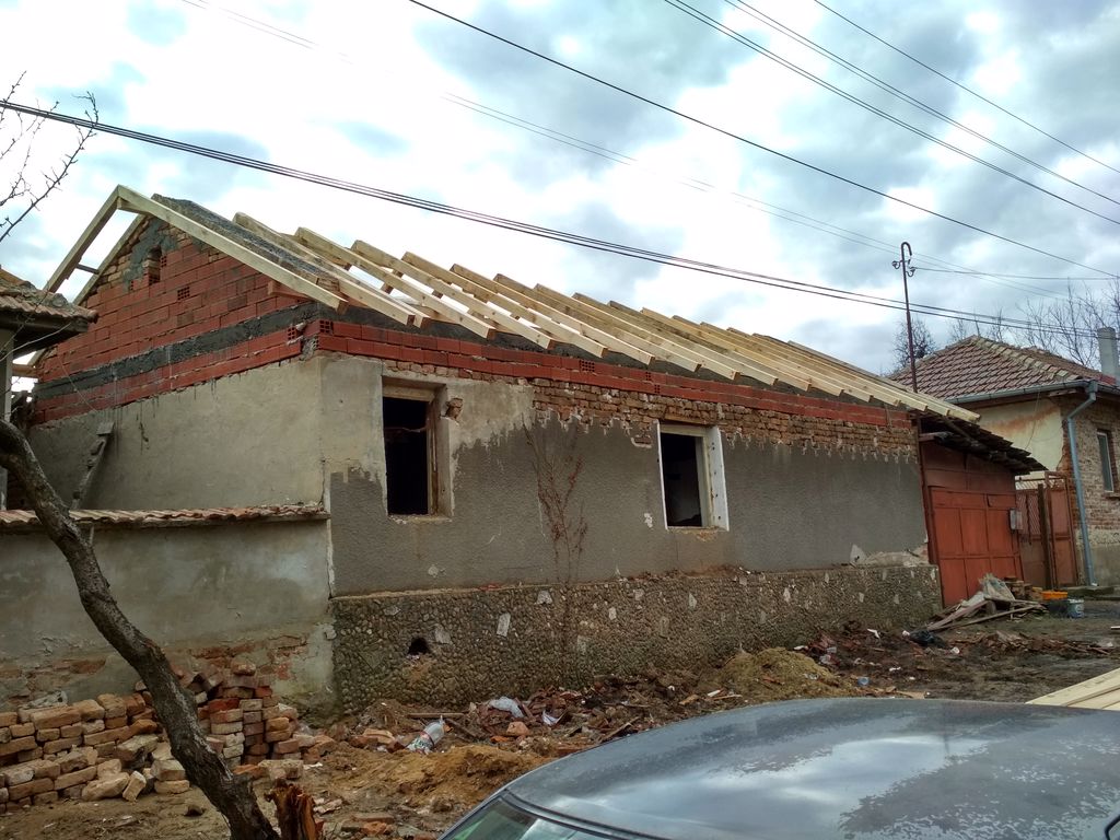 Здравейте, поредната стара селска къщурка и въпроси относно ремонта. Едноетажна, 4.5 на 10 м. външен размер. Покрива е двускатен . Намира се близо до гр. Плевен и ще се ползва основно за отмора през лятото и чат-пат през зимата. Започнат е покрива, прави се от бригада. За дъските вината е моя, явно не съм ги съхранил както трябва. Та докато ме нямаше са ги наковали с "чернилката". Гредите са обработени, между тях ще има изолация и евентуално гипсокартон. Имам като за начало няколко въпроса: