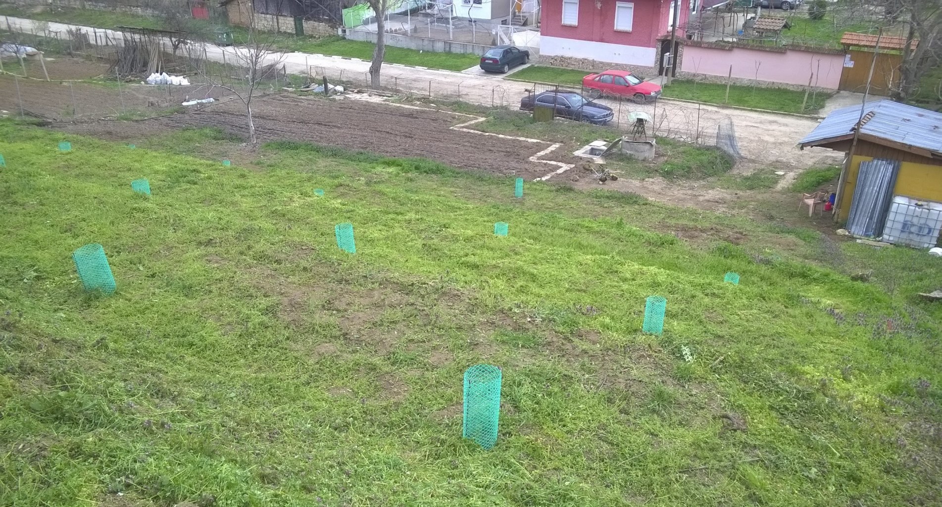 Започнах с напояването на бъдещата градина, защото още нямаше нужда на дръвчетата, а и голямата хамалогия с около 300 метра тръби не беше минала :)