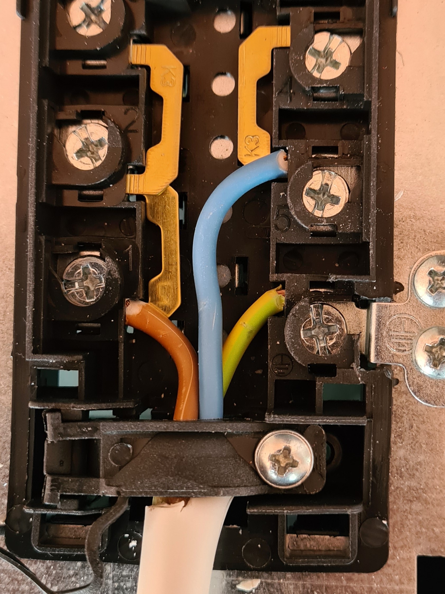 Оправи и в клемната кутия на печката скобата дето държи кабела. Слага върху бялата изолация, не върху самите жила както е на снимката.