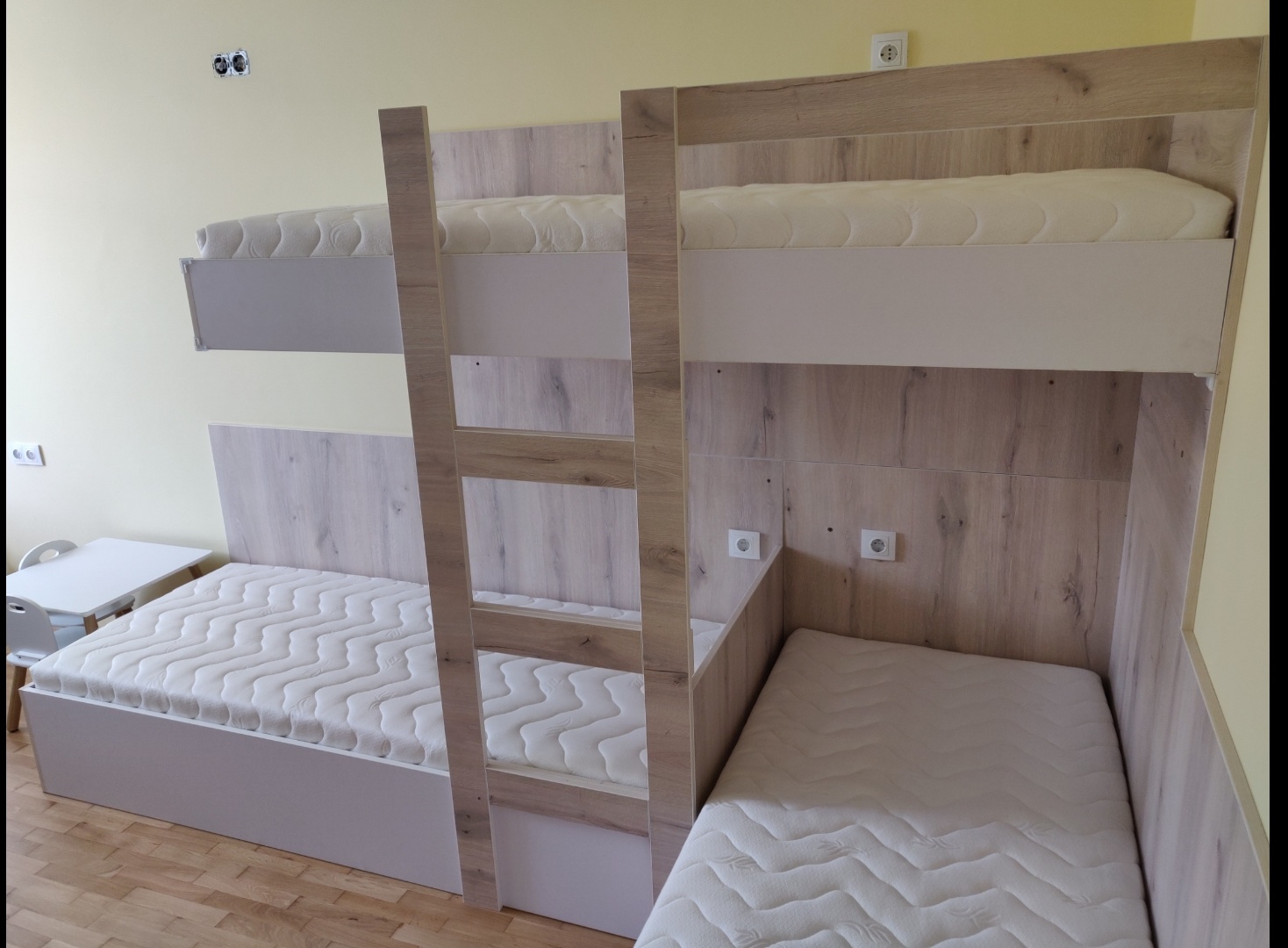 Здравейте! Не съм професионалист, но съм се захванал да правя мебелите в новото жилище. Дойде ред и на детсктата стая. В нея ще има три легла, като едното ще е двуетажно, но нестандартно. Начертал съм всичко и съм готов да го поръчвам за изработка. Материала е ПДЧ 18мм като на места (стълбата) ще е двойно. Единствената ми въпросителна все още е укрепването на ъгъла на горното легло към тавана. По принцип на едната къса и едната дълга страна ще е хванато към стената, в средата на другата дълга страна стълбата ще е и подпора, но тъй като децата ми ще спят там искам да се презастраховам и да хвана и ъгъла на леглото, който е във въздуха към тавана с нещо. Върти ми се в главата някакъв анкер в плочата, после с дълга гайка да завия шпилка, която да мине между подматрачната рамка и страниците на леглото (от вътрешната страна на ъгъла) и най - долу да е някакво триъгълно парче здрав метал с шайба и гайка. Цялото това нещо ще трябва някак да го скрия за да стане красиво и да не бъде опасно за ползване (резба на шпилка, гайка отдолу...)