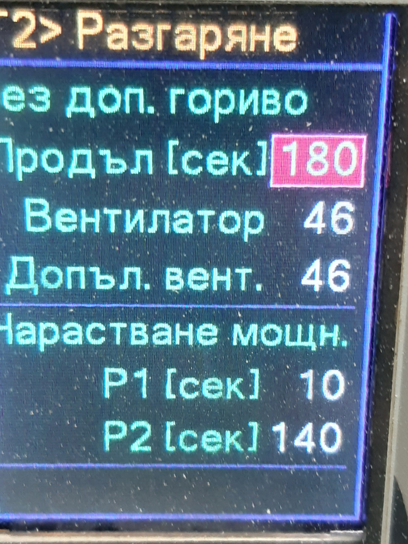 2. Горното не ми е толкова важно, но следното ми е интересно: Всеки се интересува от настройките. Те обаче са строго индивидуални от много фактори - колко радиатори, какъв обем, какво гориво и т.н. Обаче има една настройка, която е обща за всички (говоря за горелка и котел грейко 20рб и слънчогледови пелети) - това е запалването и разгарянето и евентуално модулацията до момента когато се включи помпата. Настройките са в секунди, които са различни за всички спрямо капацитета на шнека, но секундите като се обърнат в количество пелети(кг) става едно и също за всички. Да кажем, че помпата се включва на 60гр, до този момент няма циркулация на вода, т.е. има някакви оптимални и универсални настройки за достигане на температура 60гр със слънчогледови пелети. Някой да сподели опит дали е променял стандартните настройки за запалване и разгаряне за намаляване на разхода до достигане на 60гр? Защото на мен ми се струва, че моята много лапа от 20 до 60 4кг отиват, после като влезе в режим е добре, по 1кг на час. И се оказва, че почти половината от разхода за деня отива само за палене.