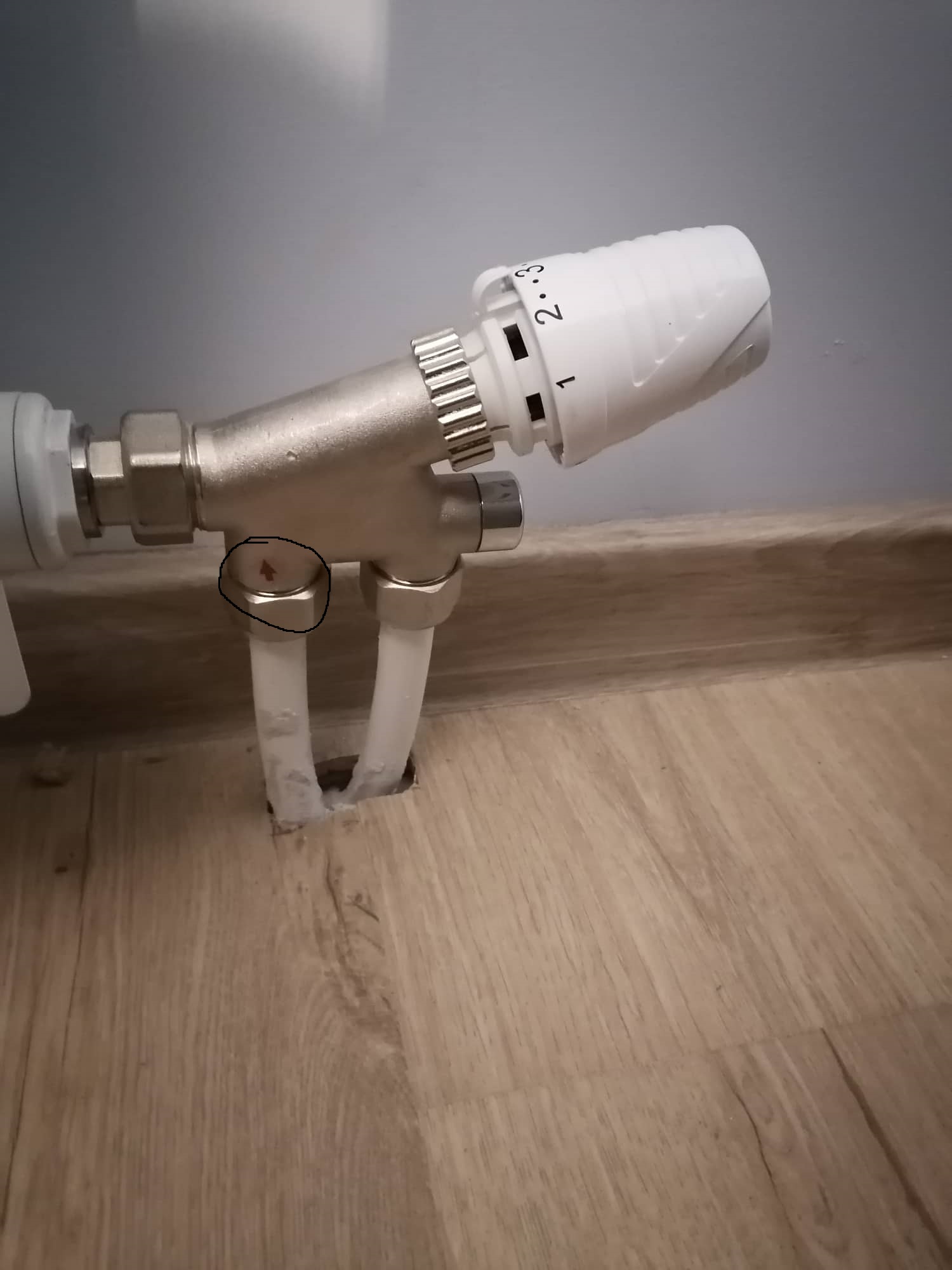 За връзката с радиатора се ползва четерипътен вентил, на който забелязах, че посоката на водата е обърната. Червената стрелка, която сочи на горе, всъщност е изхода, по който студената водата се връща в системата.