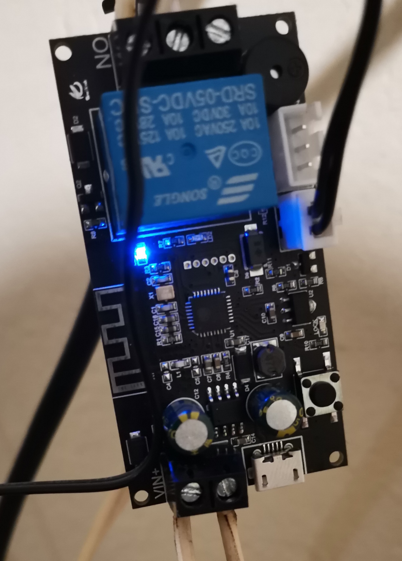 На изхода на смарт устройството имаш 220волта. Там може да си сложиш обикновен контакт и в него да включиш адаптер за 12 волта и към адаптера реле за 12волта. Ако не ти се занимава може към изхода на смарт устройството да вържеш реле 220волта, но мисля, че 12 волтовия вариант е по-разумен. :partyman: