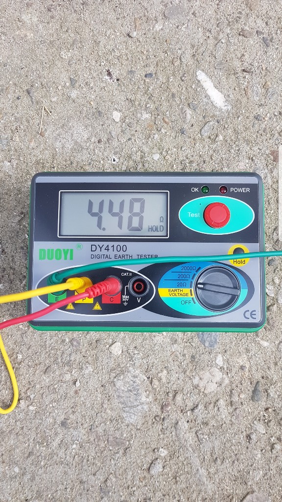 Набих още един кол, свързах го с първия и получих 11 ома съпротивление. Измерих и напрежението между L-N-PE (моето земно), като показа следното: