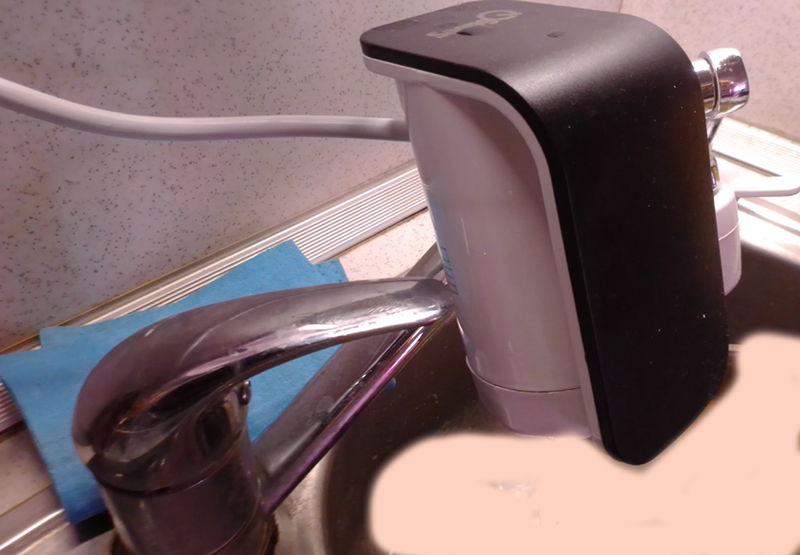 Значи трябва да се завинти към чучура вместо аератора. В края ще монтирам бойлерче (тежи 1.5 кг) за топла вода, но вместо да свалям батерията този се монтира към чучура на батерията. Бойлерът идва тежък за гъвкав удължител.