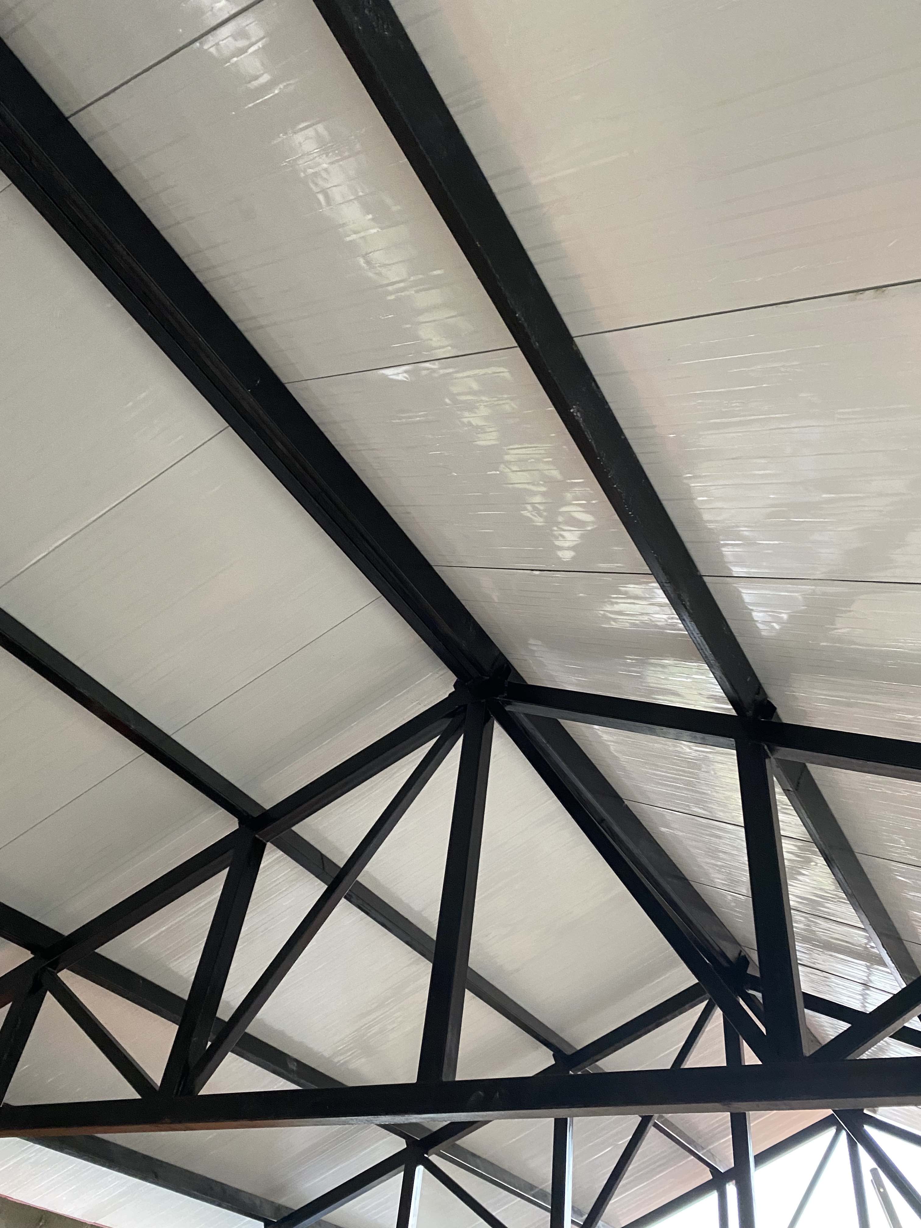 Термопанелите са тип керемида от metallemporiki. Металните греди, върху които трябва да се захванат панелите, не бяха абсолютно прави, което според монтажистите беше причина панелите да тръгнат леко на криво, тъй като горния край нямаше да може да се завинти за гредата. Аз съм си за трепане, че не ги изгоних още тогава. Е, успяха да ги нагласят, само че на места фугите бяха малко по-широки.