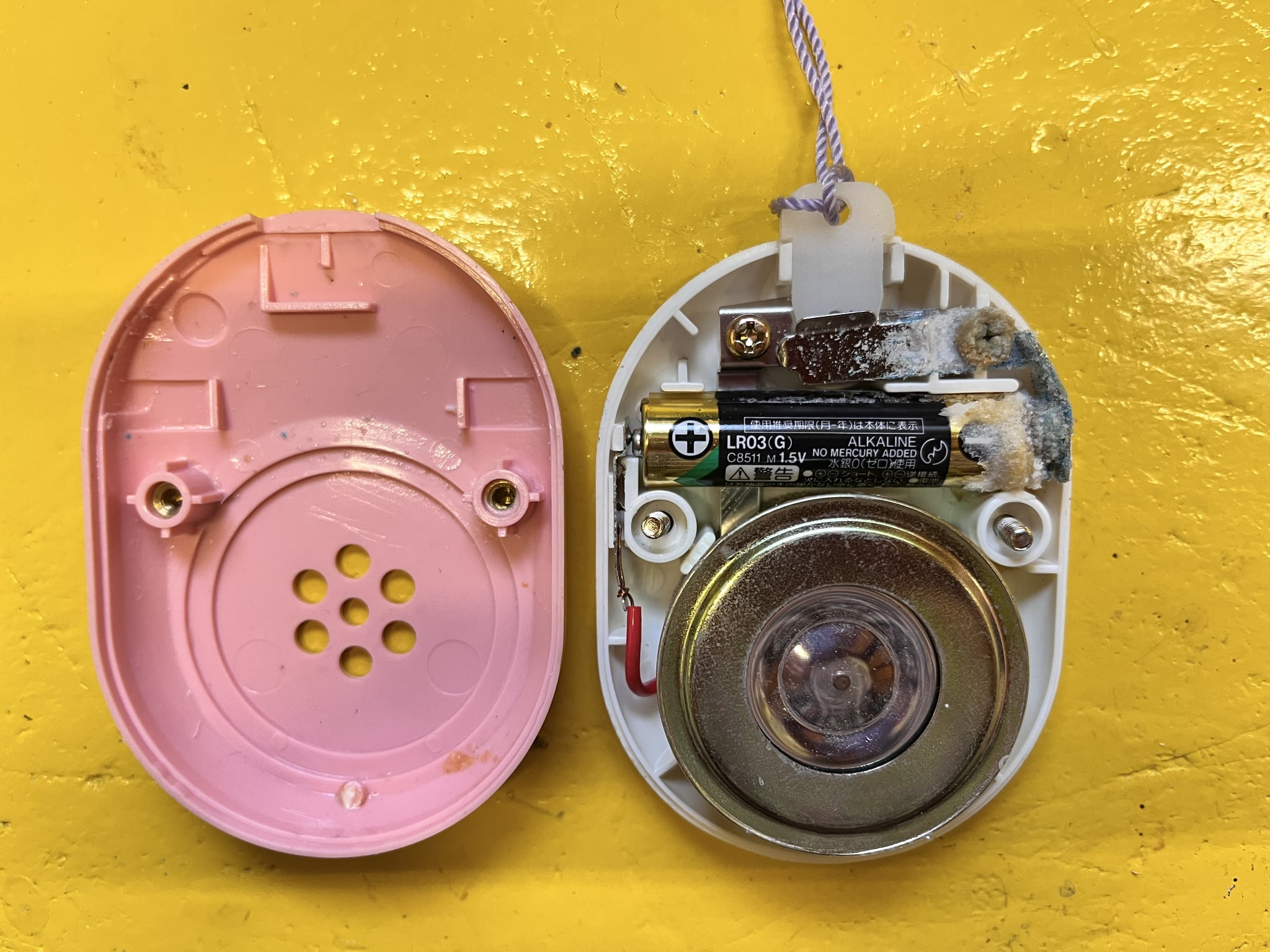 Пример за протекла батерия - почти никога не използвана. Това е аларма за открадната чанта и др. Като дръпне крадеца, пластмасовата втулка се изважда, контакта се затваря и устройството пищи с много децибели.