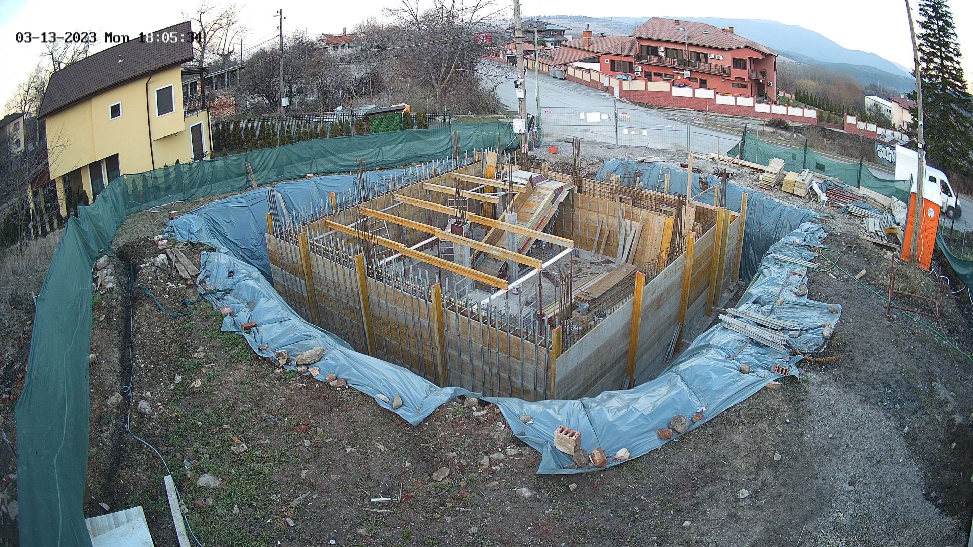 Следва полагане на хидрото, полагане на втори ред дренажни тръби (положиха няколко тръби в траншеи на около -30см от кота подложен бетон още пред да започнат с трамбоването на изкопа тъй като искаха да хванат всички води по периферията и да ги отведат в събирателната шахта), ревизии за дренажите след това поетапно засипване и трамбоване.