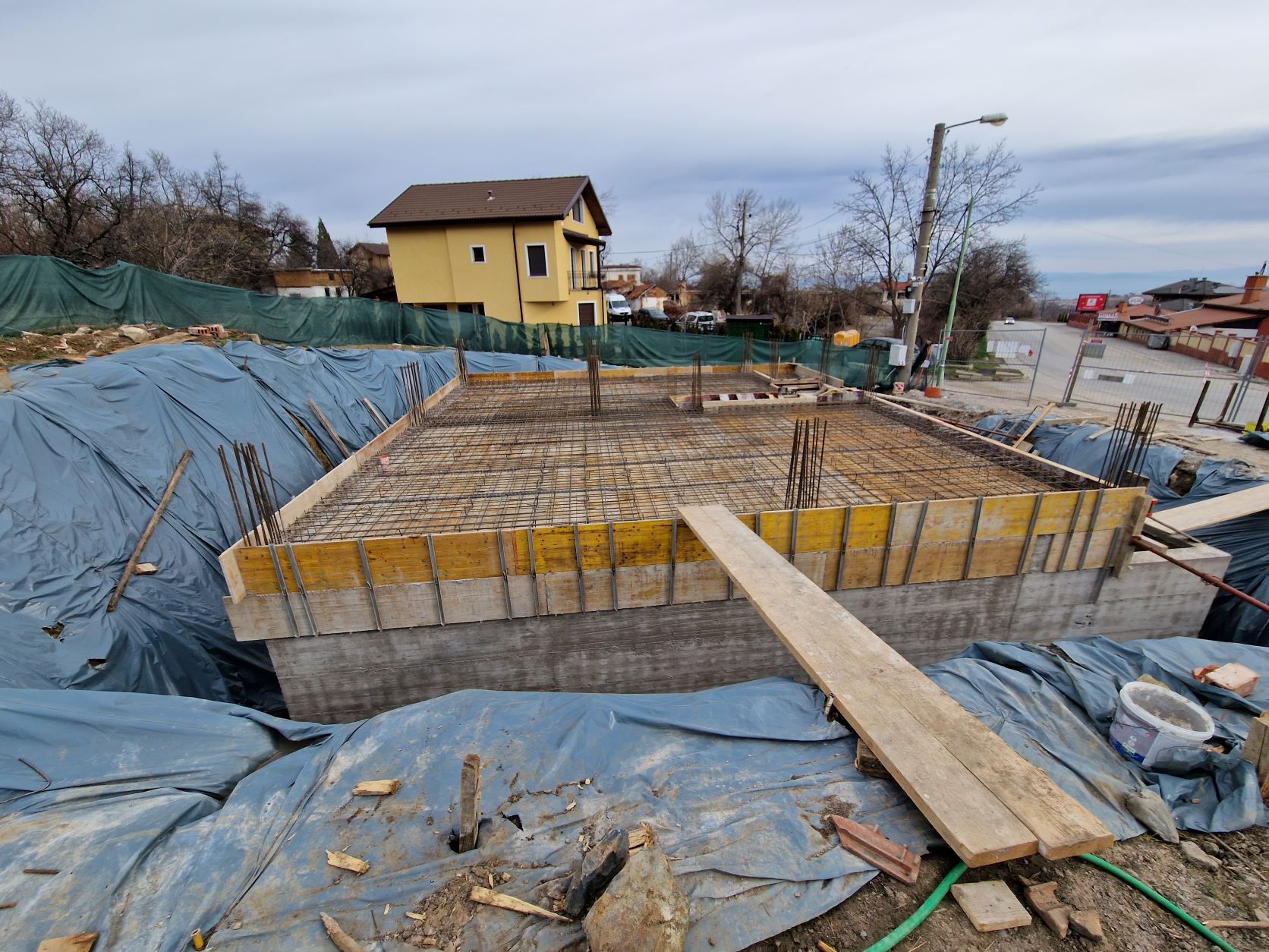 Отгоре положиха защитния бетон като хоризонталните части надстърчаха с по 30-40см извън мястото на фундаментите.
