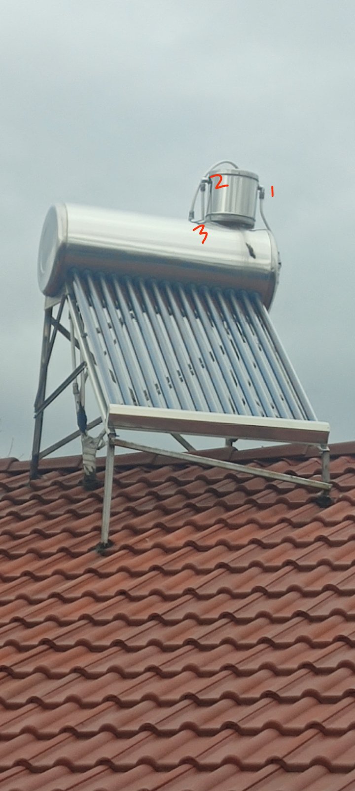Това е слънчев колектор по "Гръцката" система. По мое мнение клапана на поплавъка изпуска и се създава налягане в системата. Понеже преливника е във високата част на бойлера, логично изтича топлата вода, а студената пада ниско долу.