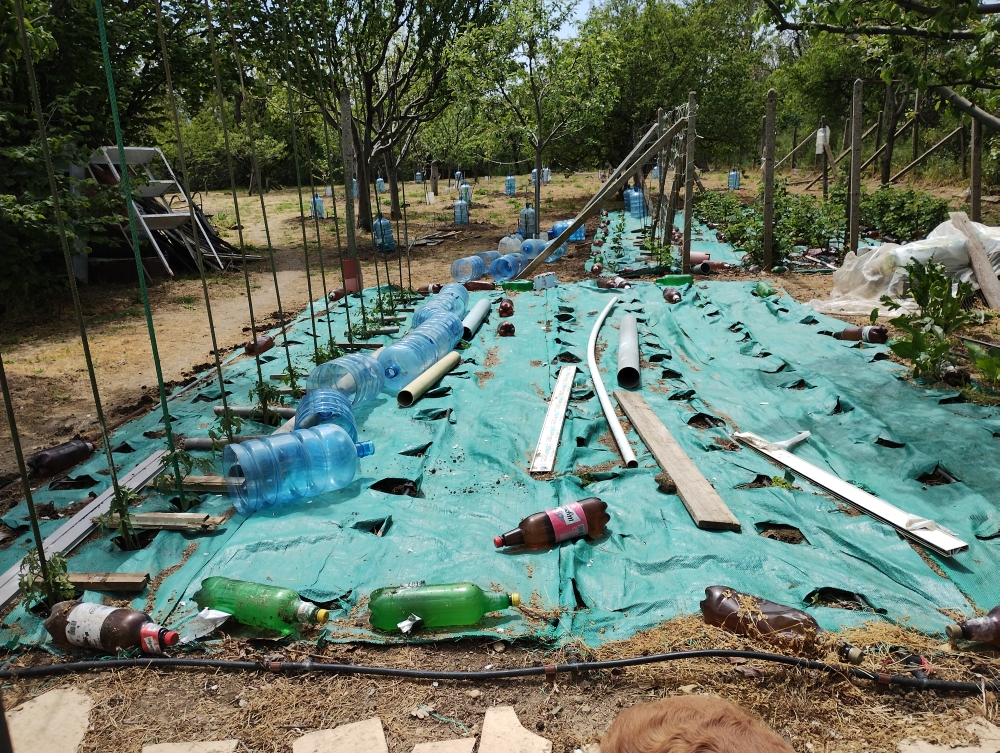 Под оранжерията имам 1ч поле 8-7 м х 5,5 м и цялото съм го заслал с тзои мълч със застъпване. Тук там някой дюбел за топлоизолация и бутилки 2л от бира с вода / ама не на 100% - да има малка въздушна междина за зимния период при замръзване./