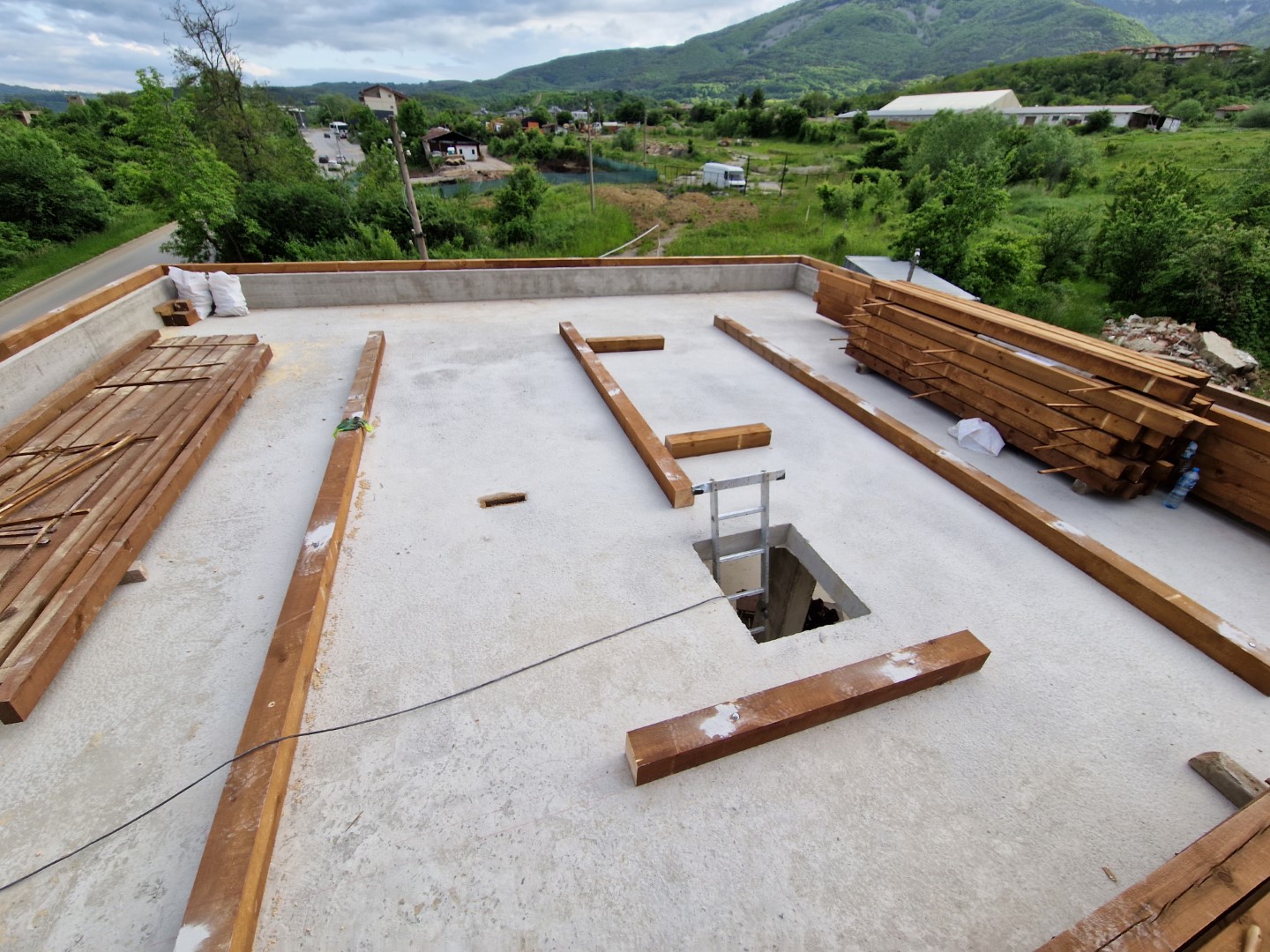 На 05.06 дойде фирмата за покрива. Започнаха да разчертват и да замерват нива и т.н. Дойде и материала за конструкцията и го качихме с кран на плочата. Момчетата казаха, че борда и плочата са перфектни и има съвсем леки отклонения в рамките на милиметри. Като цяло казаха, че рядко попадат на подобни обекти и, че трябва да похваля строителя:)