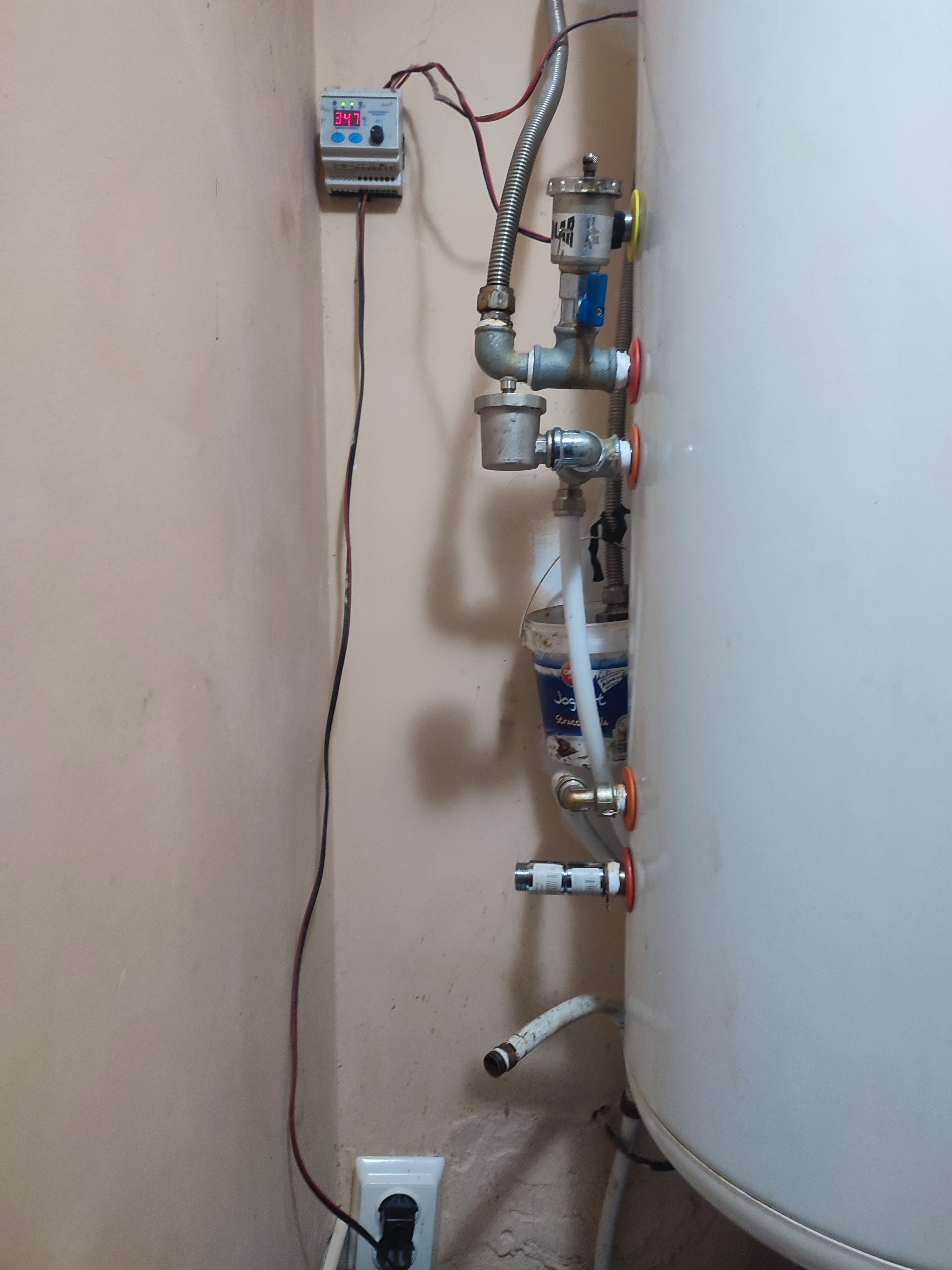 Системата е затворена с неръждавейка тръби и един колектор.Като цяло за това време си работеше добре първите 7-8 години. После почна да протича на места главно по наставките на "гофрето"На снимката не се вижда , но има удължение/наставка около 1 метър на тръбата на студената вода.Един майстор преди да направим покрива искаше на единия скат а друг след 1 година прецени на сегашното място.