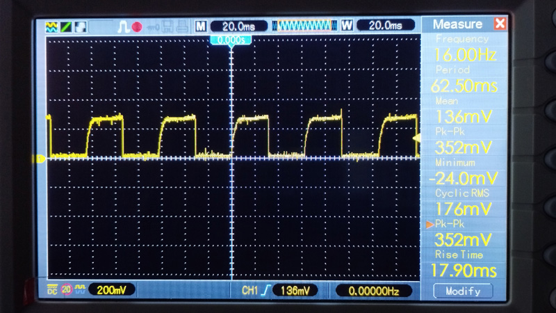 Общо взето на часовник, който е с плавно движение - с мултицет ми показа около 1.4 милиампера - батерията я ядеше за около месец(отдавна вече стои неизползваем). С осцилоскоп към мултицета консумацията на ток изглежда така - 16 херца: