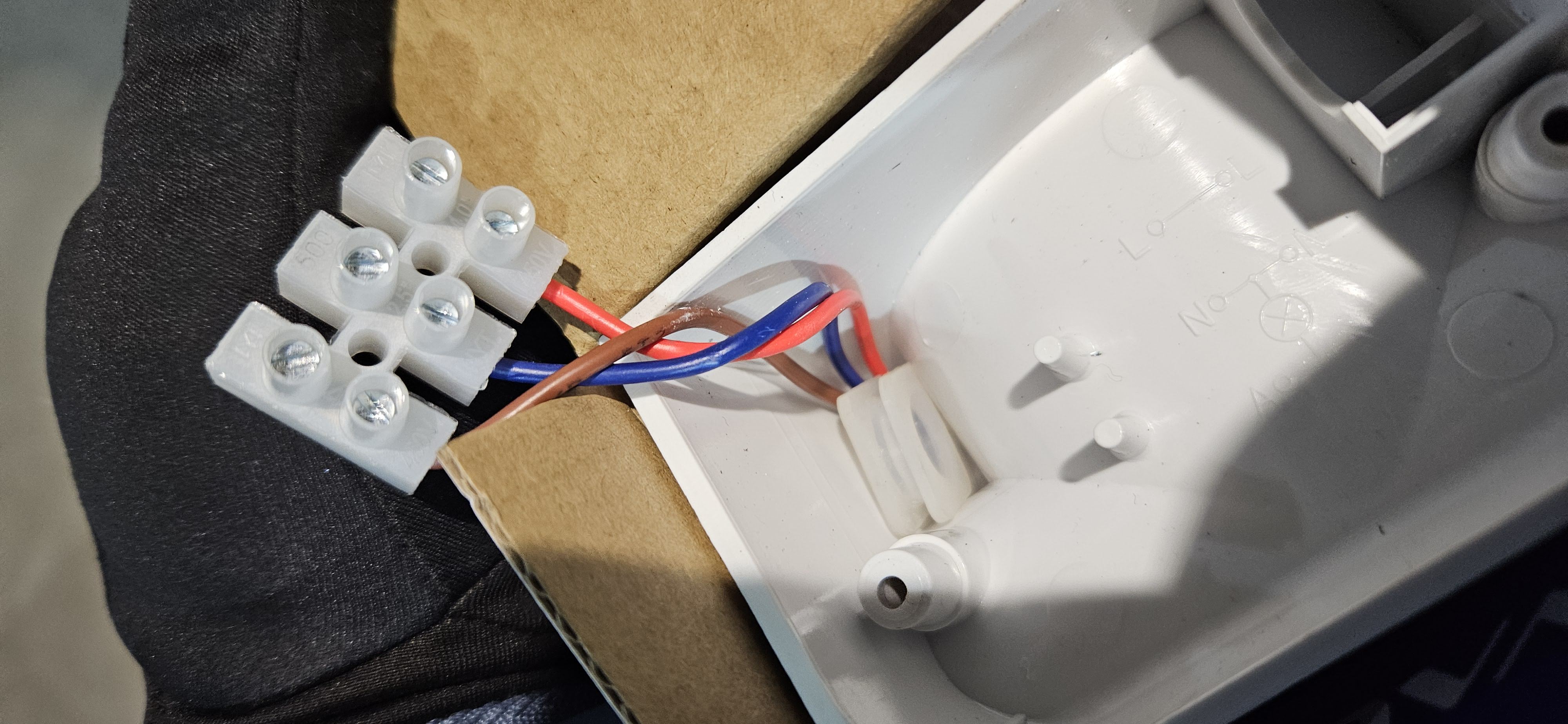 Съгласно схемата, през датчика от идващи постянни фаза и нула минава фазта и отива до прожектора, а той упралява нулата, т.е. прекъсва я като входящата нула е синя жичка, а изходящата при движение е червената. Това ми се стори малко нелогично/да прекъсва 0-та/, но въпреки това го вързах така. В кафявата идва и излиза фаза към прожектора, в синята - идващата нула, а червената 0 - към прожектора.