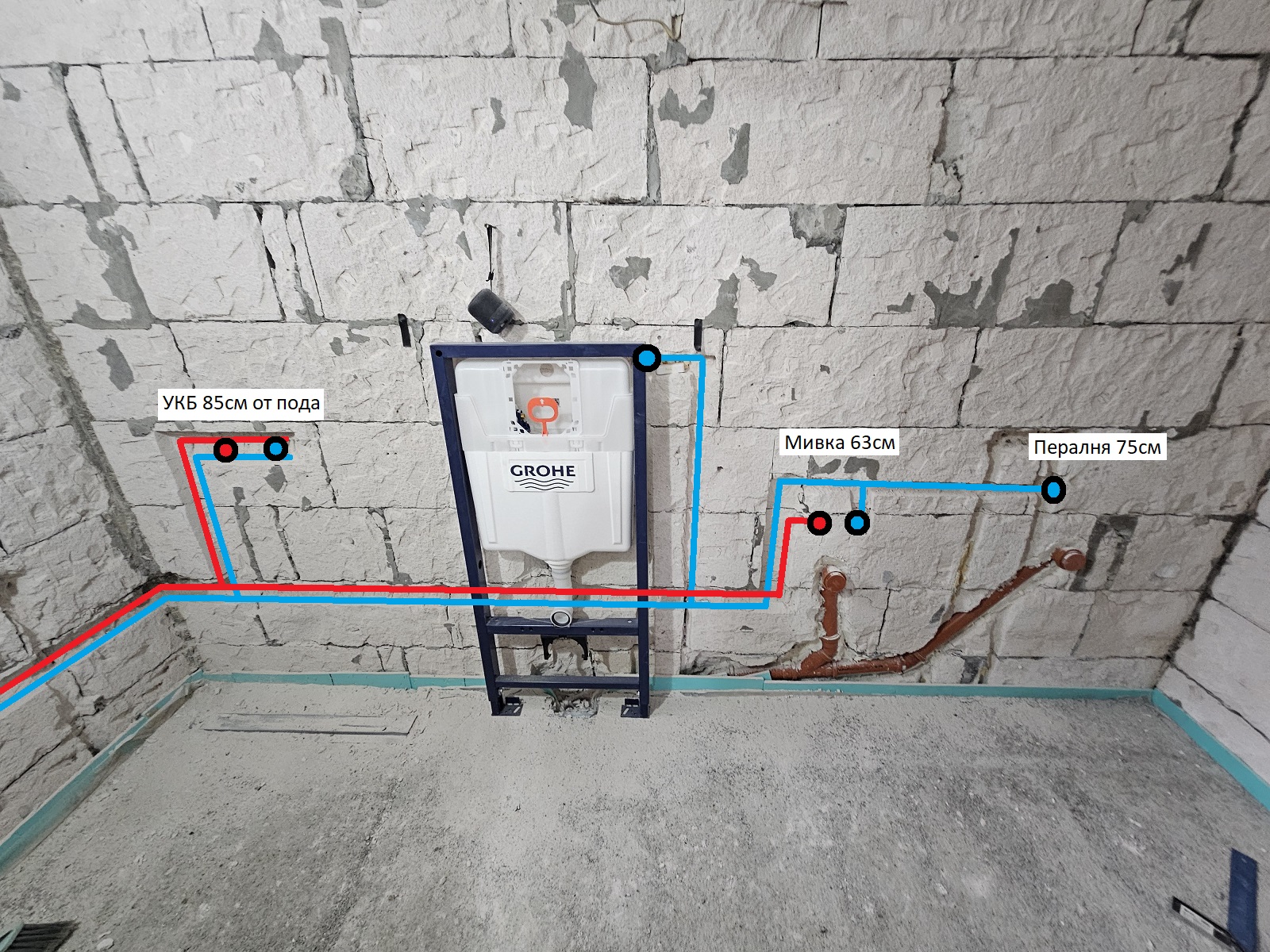 На снимката съм нарисувал горе-долу изводите за вода, но разстоянието от пода все още го уточнявам.
