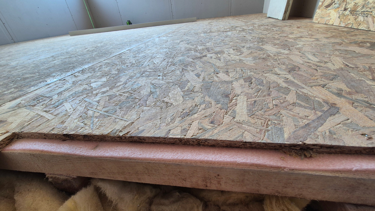 Споделям вариация на метода от по-горе. В едната спалня по ъглите плочата беше доста високо, на -1см спрямо нивото на 5х5, следователно нямах място за двойна скара. Реших да пробвам през метър да подпра 5х5 с трупчета изрязани по размер от същите греди, да подмажа гредичките и след изсъхване да монтирам подложка по дължината и направо OSB отгоре. Резултатът се получи доста добър, а времето за работа беше на половина по-кратко. Поддаването при стъпване между трупчетата беше милиметри. Ако се сложат на по-гъсто вероятно може да се мине и без подмазване дори. 30см център-център за 5х5.