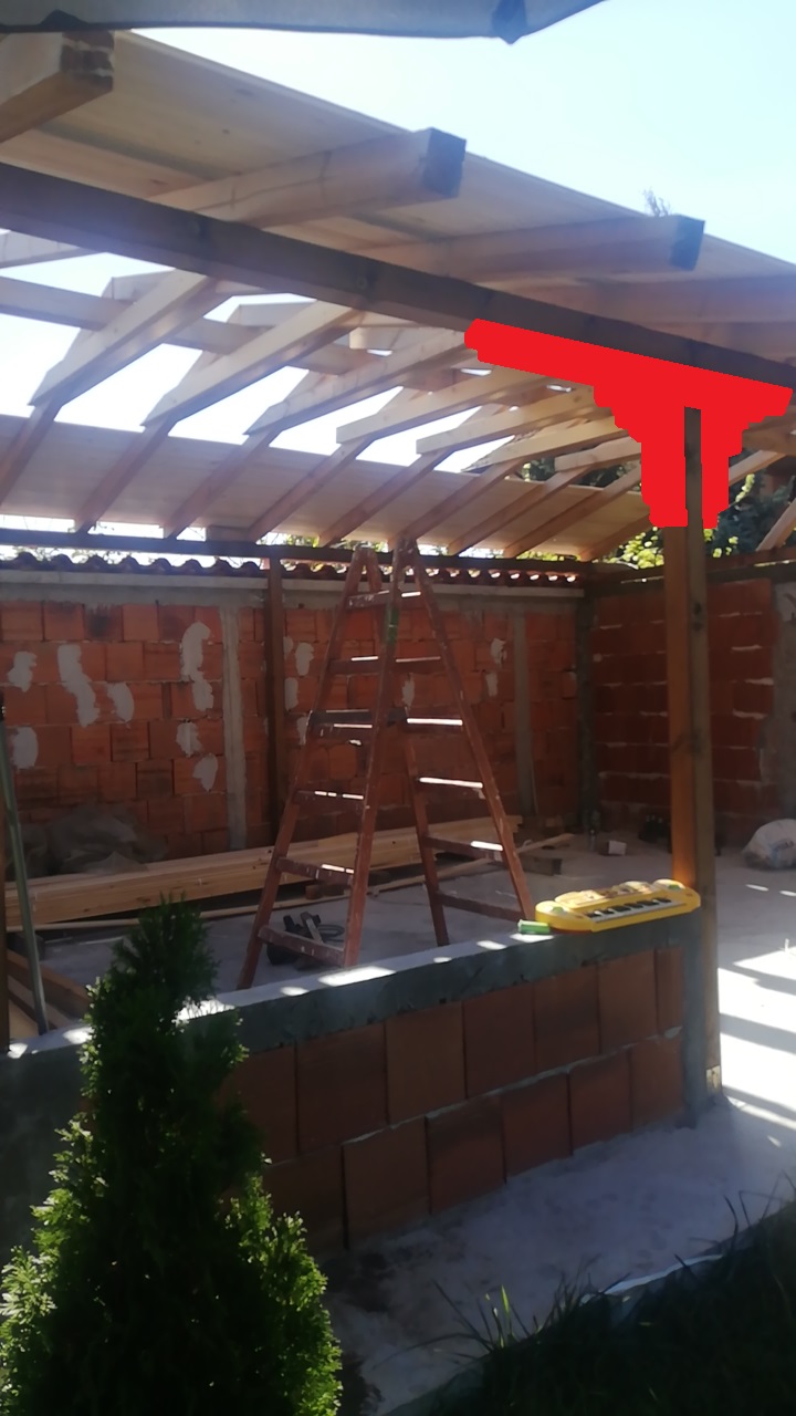 Това не е беседка. Това си е навес. На хоризонталните греди трябва да помогнеш. Подпираш с крик и надигаш леко. Режеш примерно 10см от вертикалната и подмушваш хоризонтална уж с декоративни функции. Прикрепваш с основната греда чрез шпилки и вкопани гайки и шайби. Ако те дразнят крепежите замажи ги с авто кит и боядисай отгоре. На вертикалните от двете страни пак по един декоративен елемент хванат със шпилки. Получените ъгли между декорациите може да ги спънеш с някой ъглов орнамент. Ребрата горе изглеждат достатъчни.