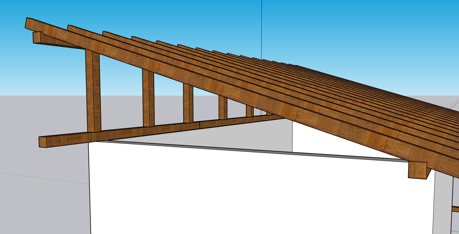 Като в главата си представям, че тежестта ще легне на пояса и колоните в началото и края на покрива, тъй като няма да има допирни точки в средата и не мисля, че ще са нужни подпорни греди в самата стая. Няма да е двускатен, не мисля че ще има място за триъгълници.